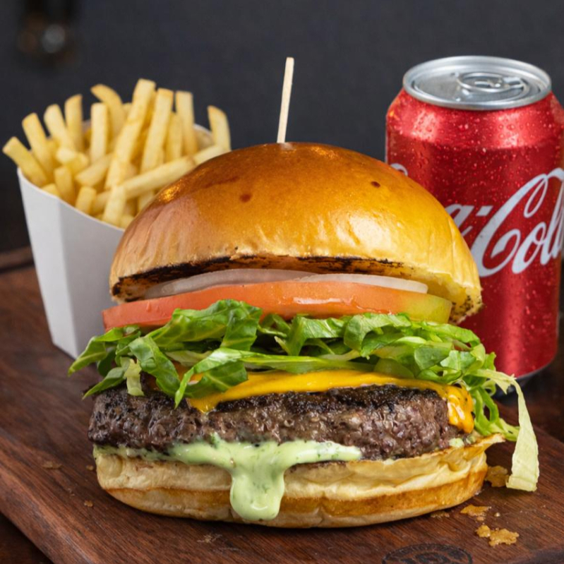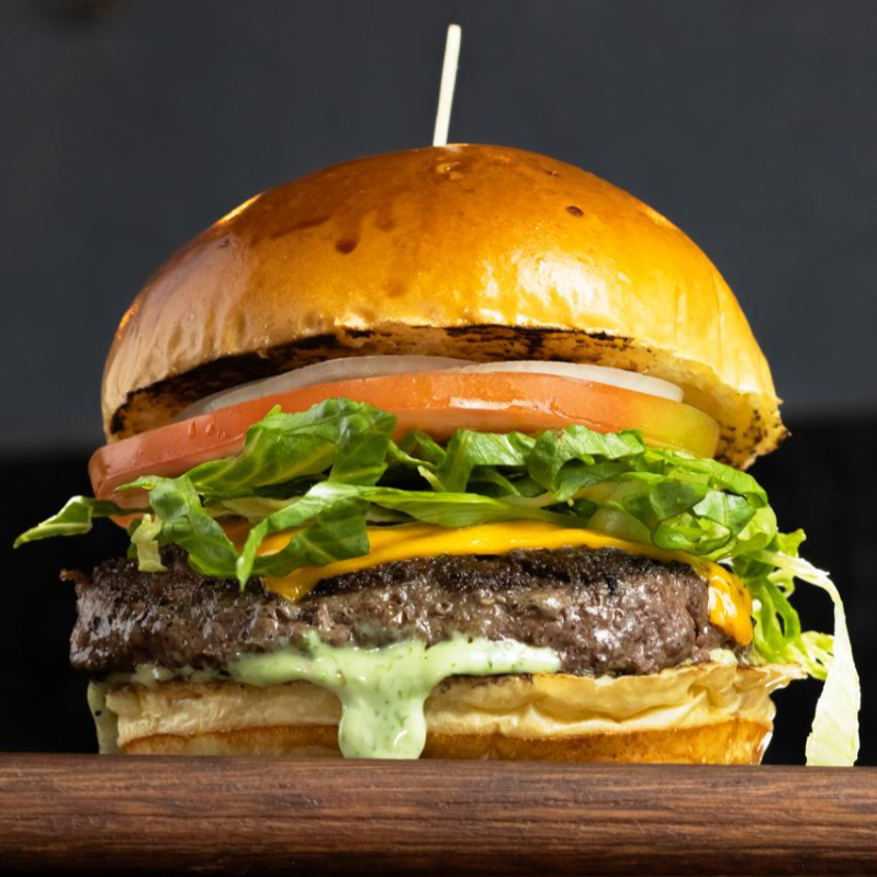 Pão de brioche, Blend Angus 160g, Queijo Cheddar Polenghi, Salada Fresca (alface, tomate e cebola) e Maionese Verde Temperada