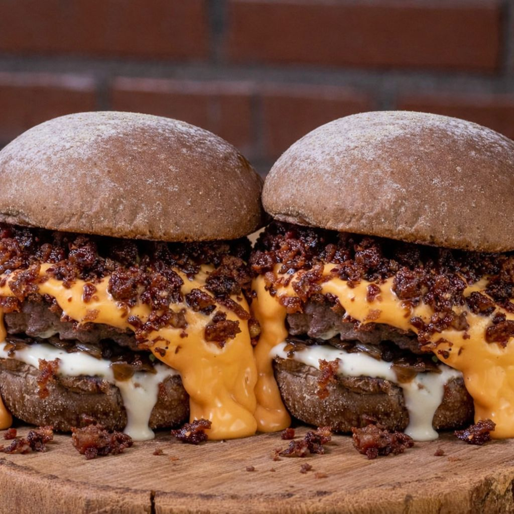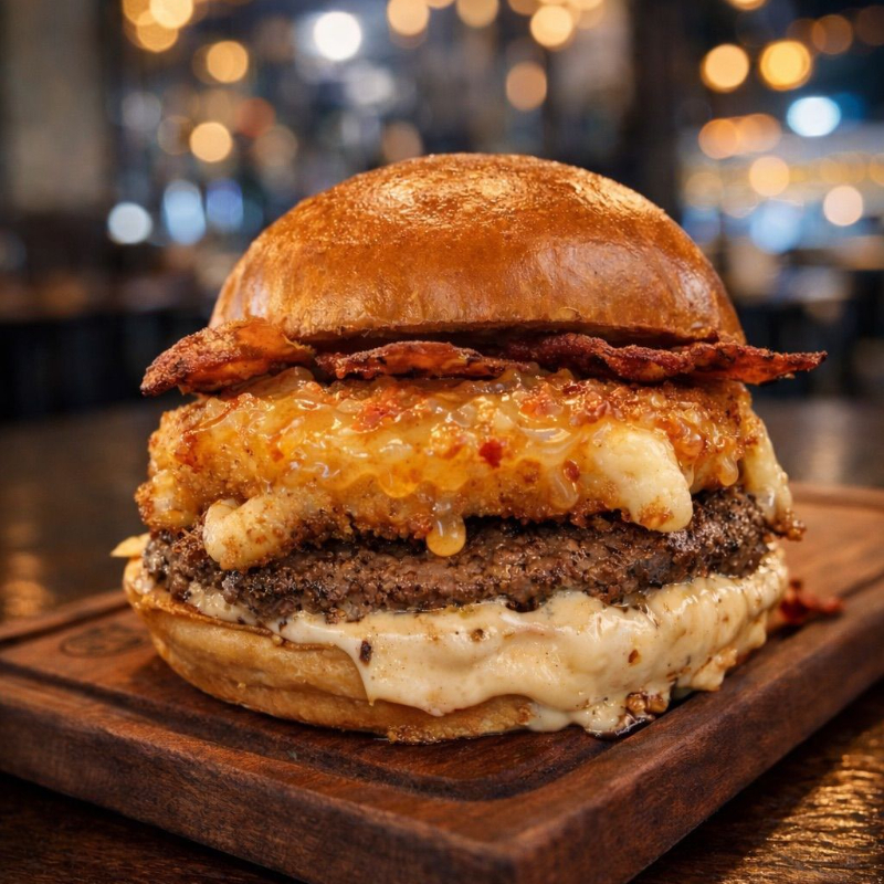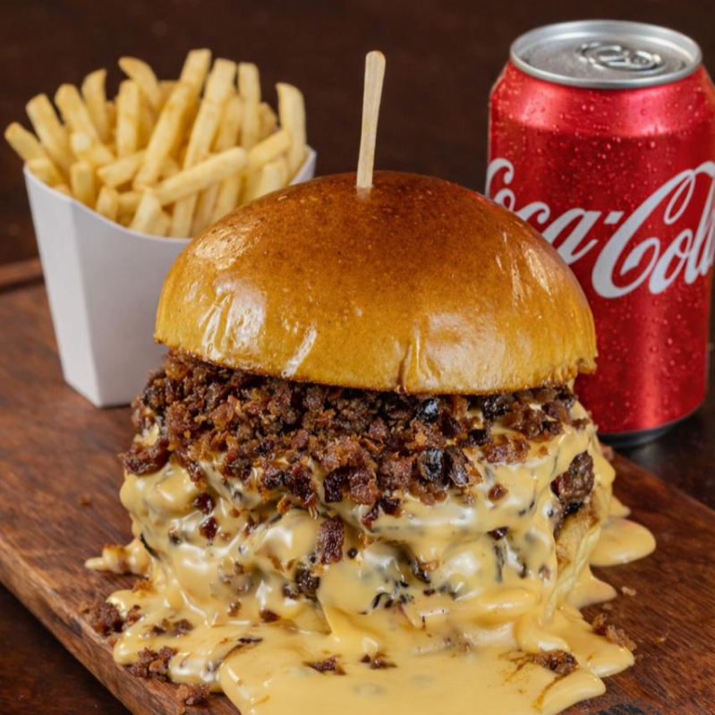 Pão brioche, 2 Blends Angus 100gr, Muiiiiitoo Creme de Cheddar, Muiiiitoo Bacon uma maionese da casa pra finalizar