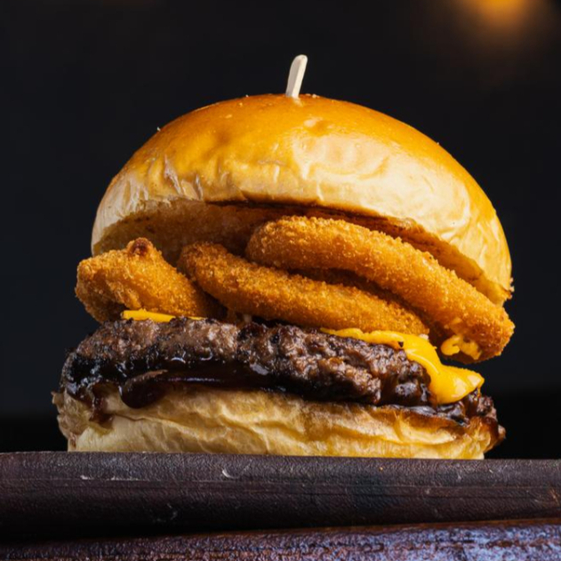 Pão brioche, Carne Angus 160gr, Queijo Cheddar, Anéis de Cebolas Empanados e Barbecue Defumado