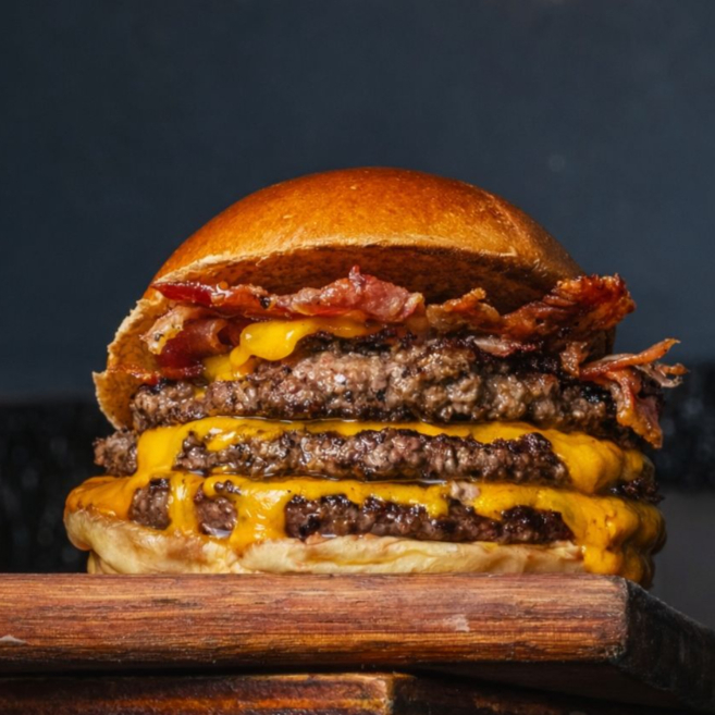 Pão brioche, 3x Carnes Angus 100gr, 3x Queijo CheddaR, 3x Bacon em Fatias e MAionese da Casa