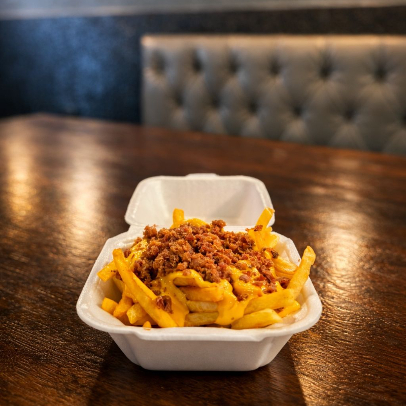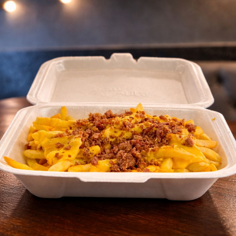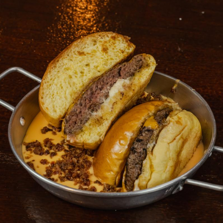 Pão brioche, Carne Angus 160gr, Queijo Cheddar e maionese da casa banhados em uma piscininha com muito creme de cheddar e muito bacon