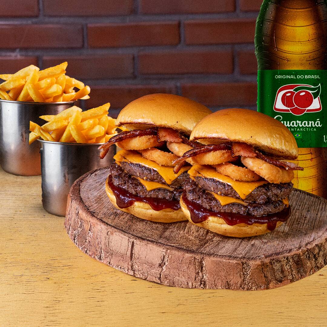 Pão de brioche, 2 Blends Angus 100g, queijo 2x, bacon, anéis de cebola empanados e Molho Barbecue Defumado