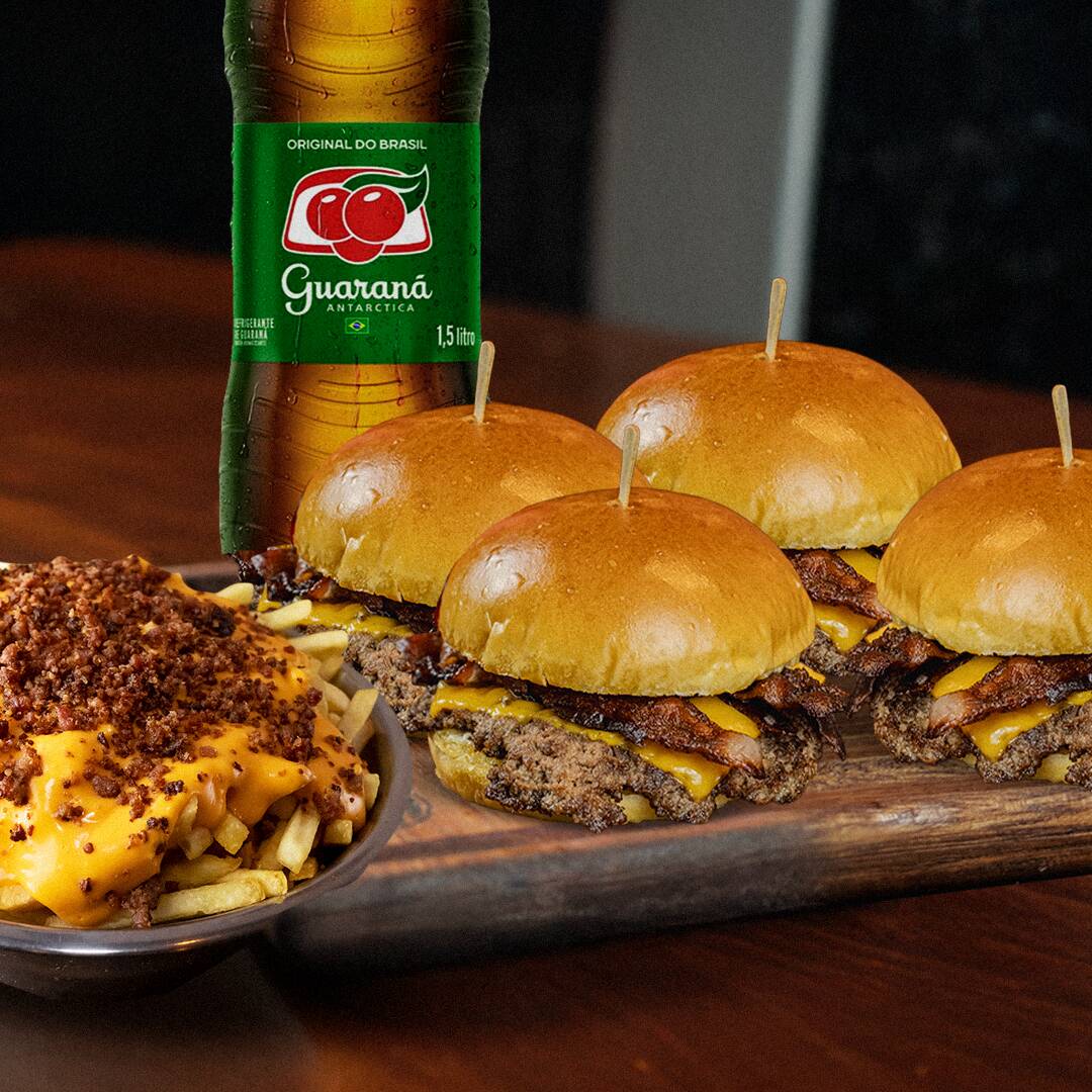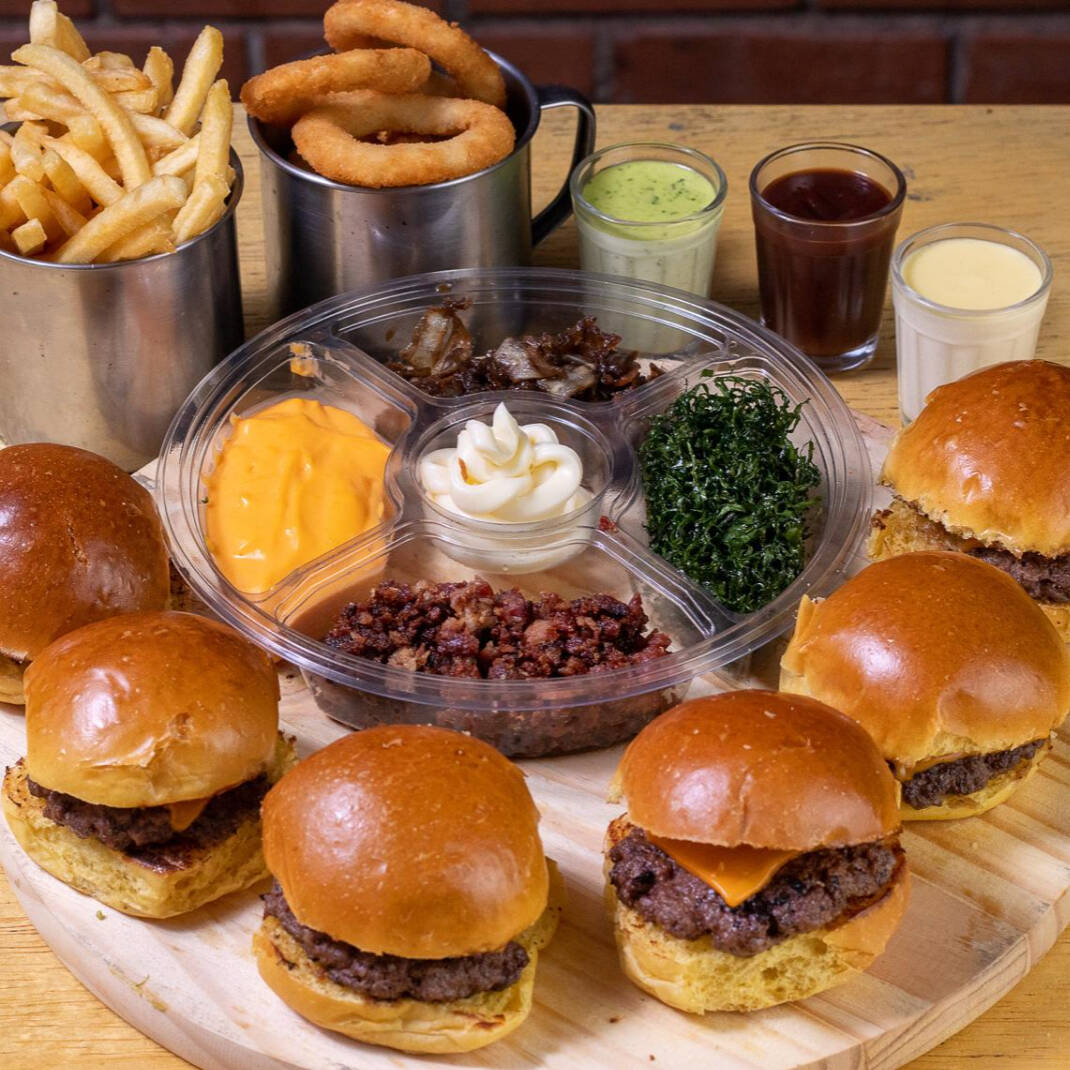 6 Mini Hamburgueres - Creme de cheddar, Bacon, Couve Crispy, Cebola Caramelizada, Catupiry. 1 Porção de Onion Rings 1 Porção de Batata Frita 3 Tipos de Molho