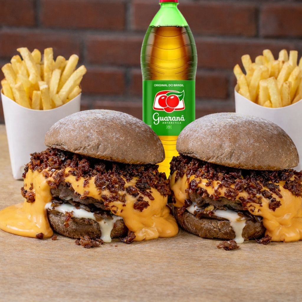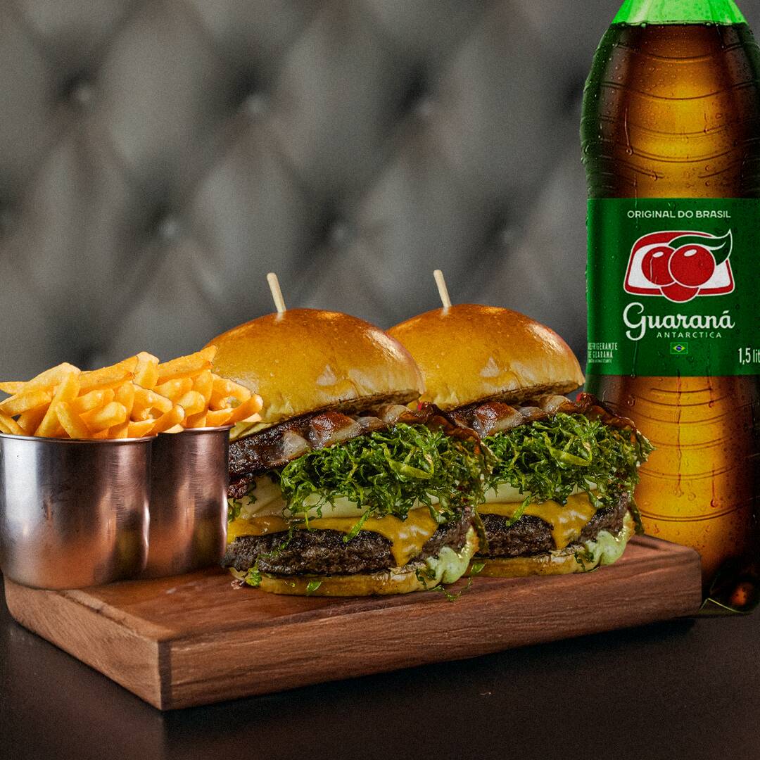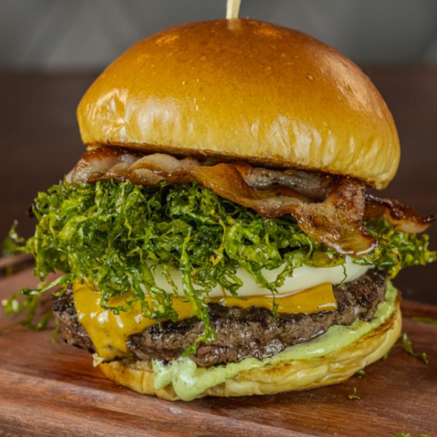 Pão de brioche, Blend Angus de 160g, queijo, Catupiry Original, crispy de couve, bacon e Maionese Verde Temperada
