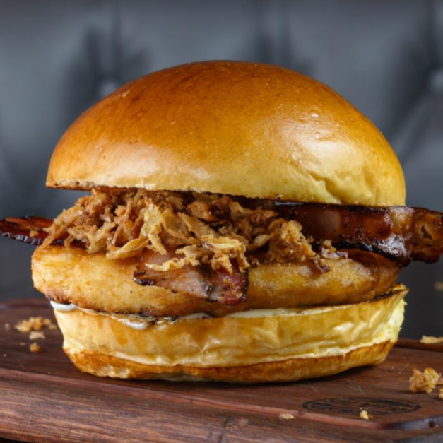 Pão brioche, Hamburguer de Frango com empanamento especial, queijo cheddar, bacon em fatias, cebola crispy e maionese Silver