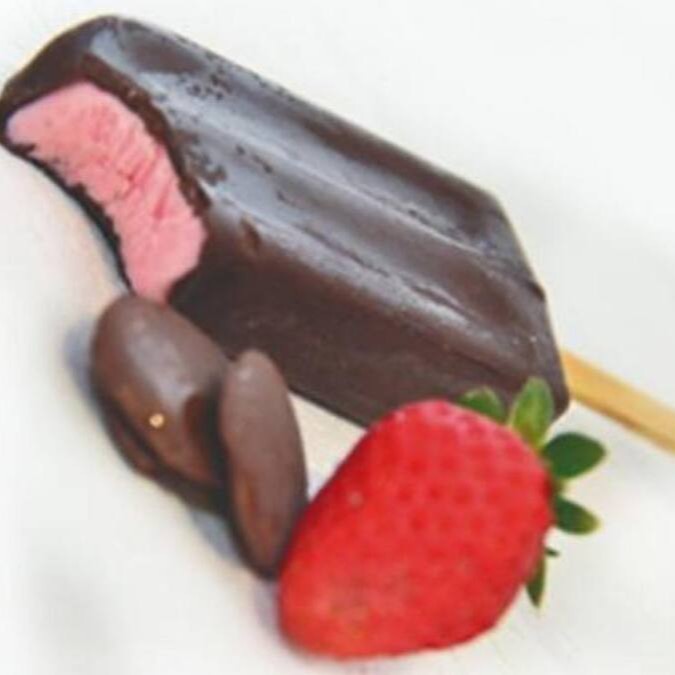 Saborosos picolés de 2 sabores: Morango com chocolate e Coco com chocolate.