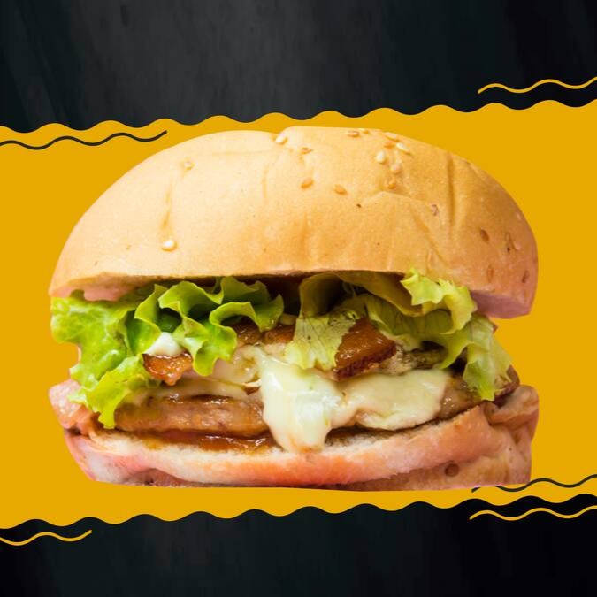Pão, 2 carnes com queijo cheddar, cebola frita na manteiga, fatia de pão no meio, katchup e maionese Hellmans