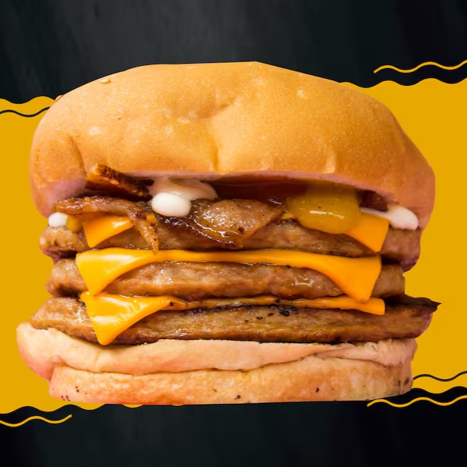 Pão com gergelim, 3 carnes, queijo cheddar, bacon, katchup, barbecue, mostarda e maionese temperada