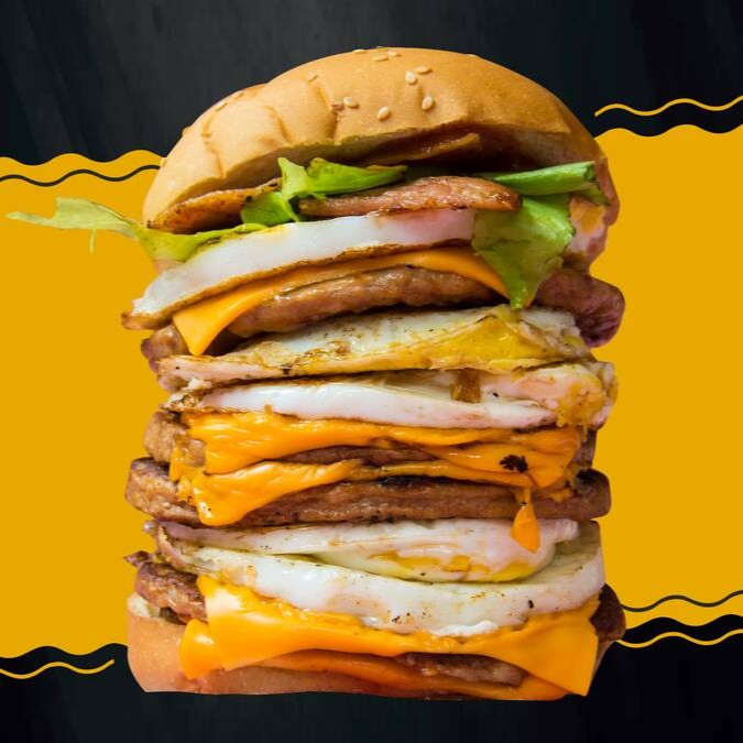 Pão com gergelim, 4 carnes, 2 ovos, queijo cheddar, bacon, salada, barbecue, maionese temperada, katchup, mostarda