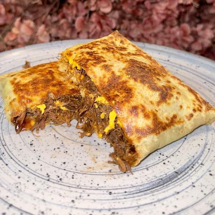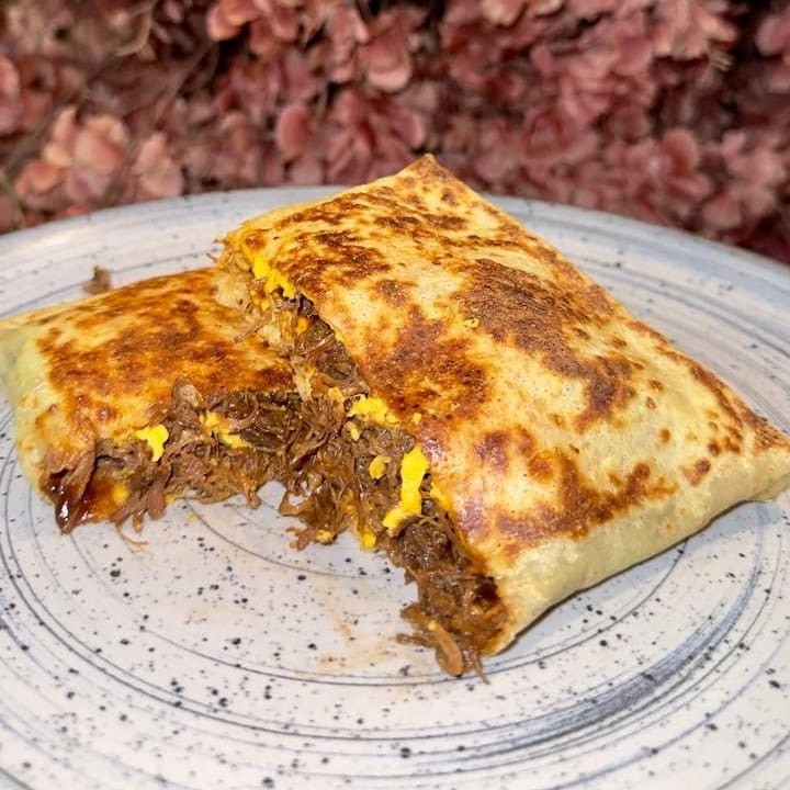 Massa branca recheada com carne assada, cheddar e molho barbecue.