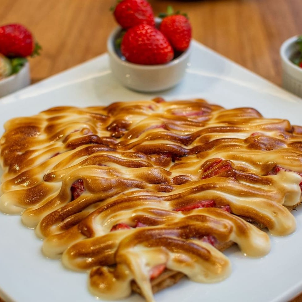 Massa branca , morango, leite condensado e chocolate branco maçaricado