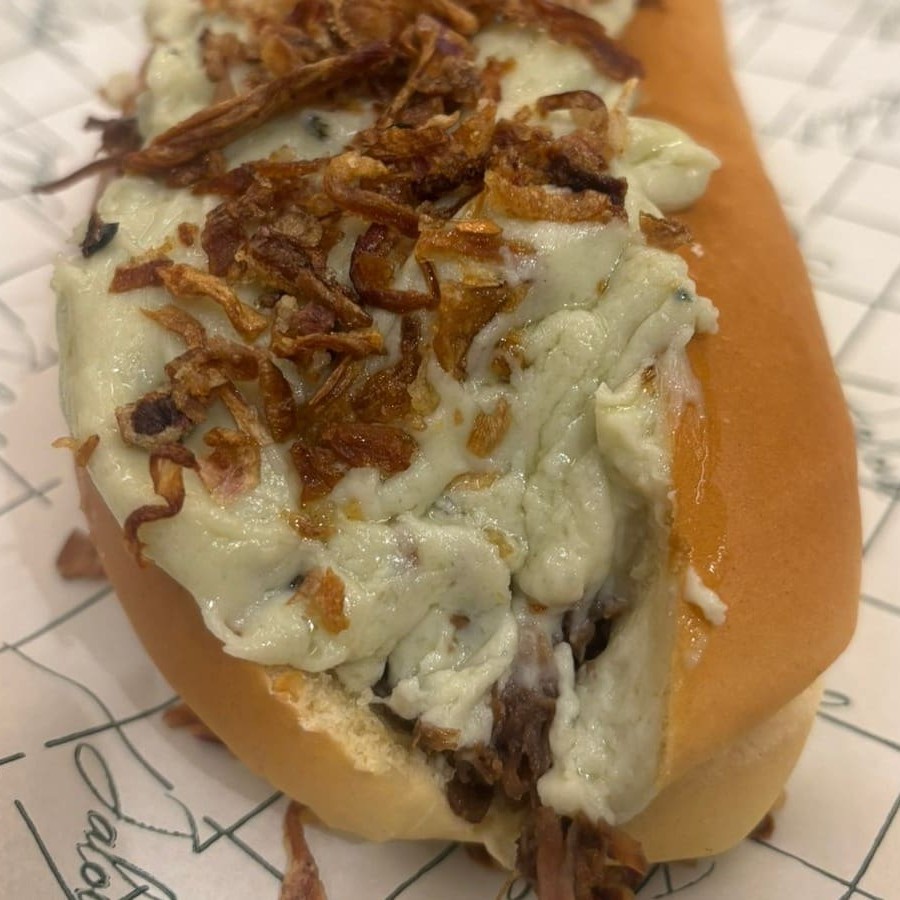 Pão Brioche , carne assada , creme de gorgonzola e cebola crispy