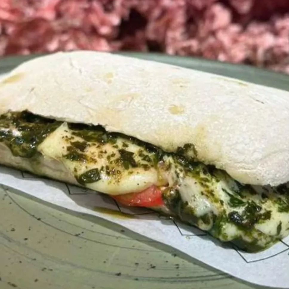 Pão ciabatta, tomate, cream cheese,mussarela e pesto de manjericão