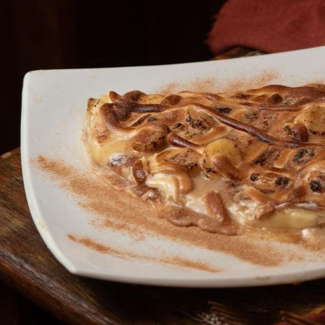 Massa branca,mussarela,banana, leite condensado,canela e chocolate branco maçaricado