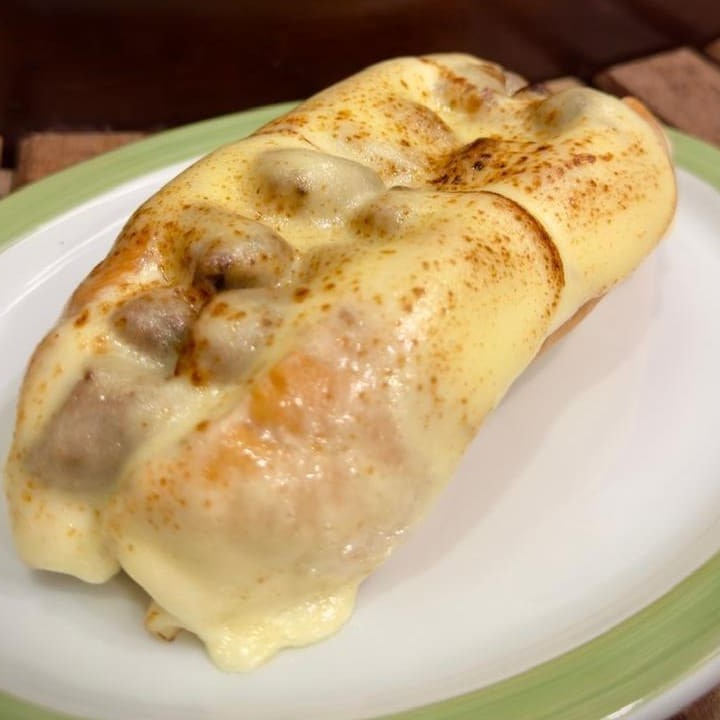 Massa branca recheada com carne assada, Catupiry e queijo mussarela.