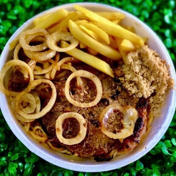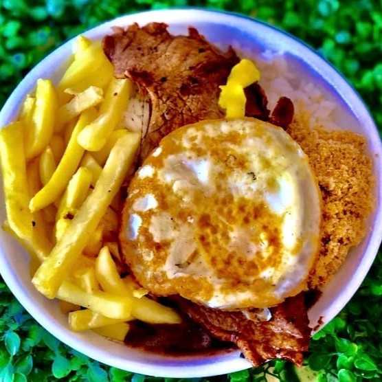 Refeição (Quentinha) Acompanha: Bife a cavalo, arroz, feijão, macarrão, farofa, fritas ou legumes