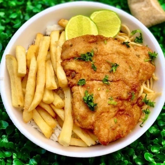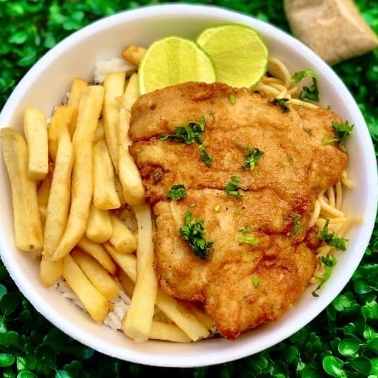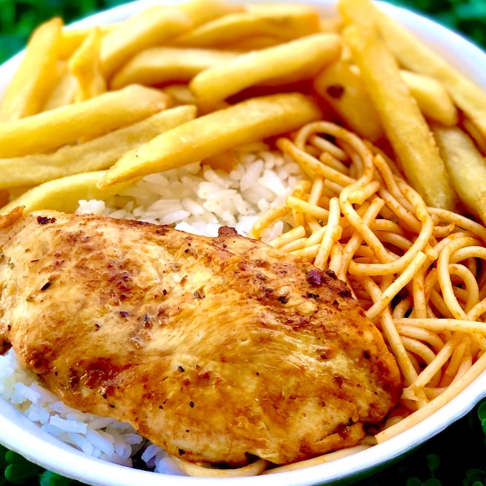 Refeição de filé de frango á milanesa Acompanha: Arroz, feijão, macarrão, farofa separada e fritas ou saladas