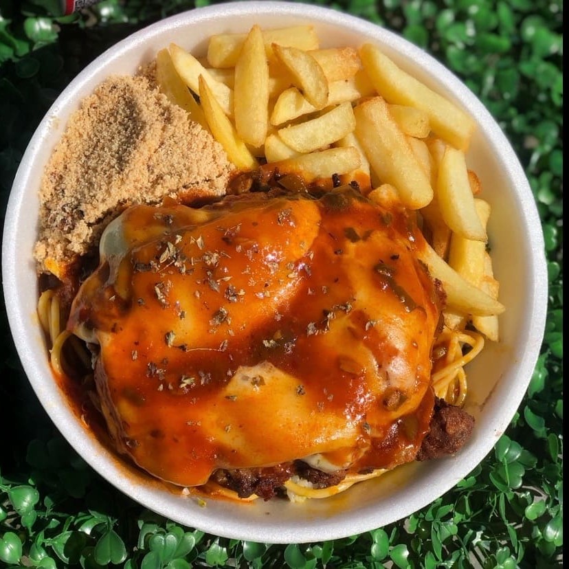 Refeição (Quentinha) Acompanha: Filé de frango a parmegiana, arroz, feijão, macarrão, farofa, fritas ou legumes