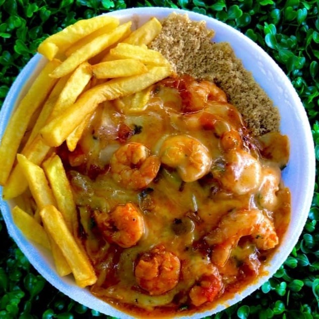 Refeição (Quentinha) Acompanha: Peixe ao molho de camarão, arroz, feijão, macarrão, farofa e fritas ou saladas