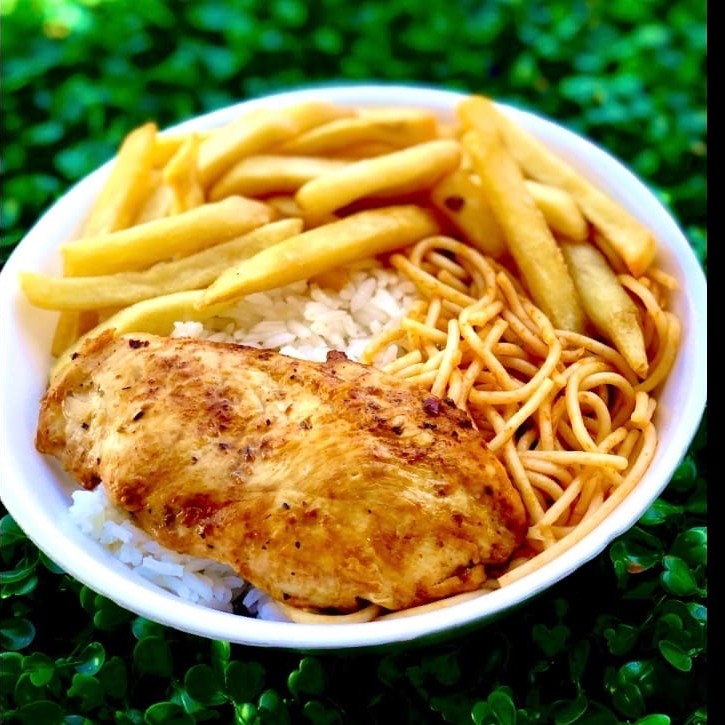 Refeição (Quentinha) Acompanha: Filé de frango grelhado, arroz, feijão, macarrão, farofa, fritas ou legumes