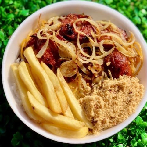Refeição (Quentinha) Acompanha: Calabresa acebolada, arroz, feijão, macarrão, farofa, fritas ou legumes