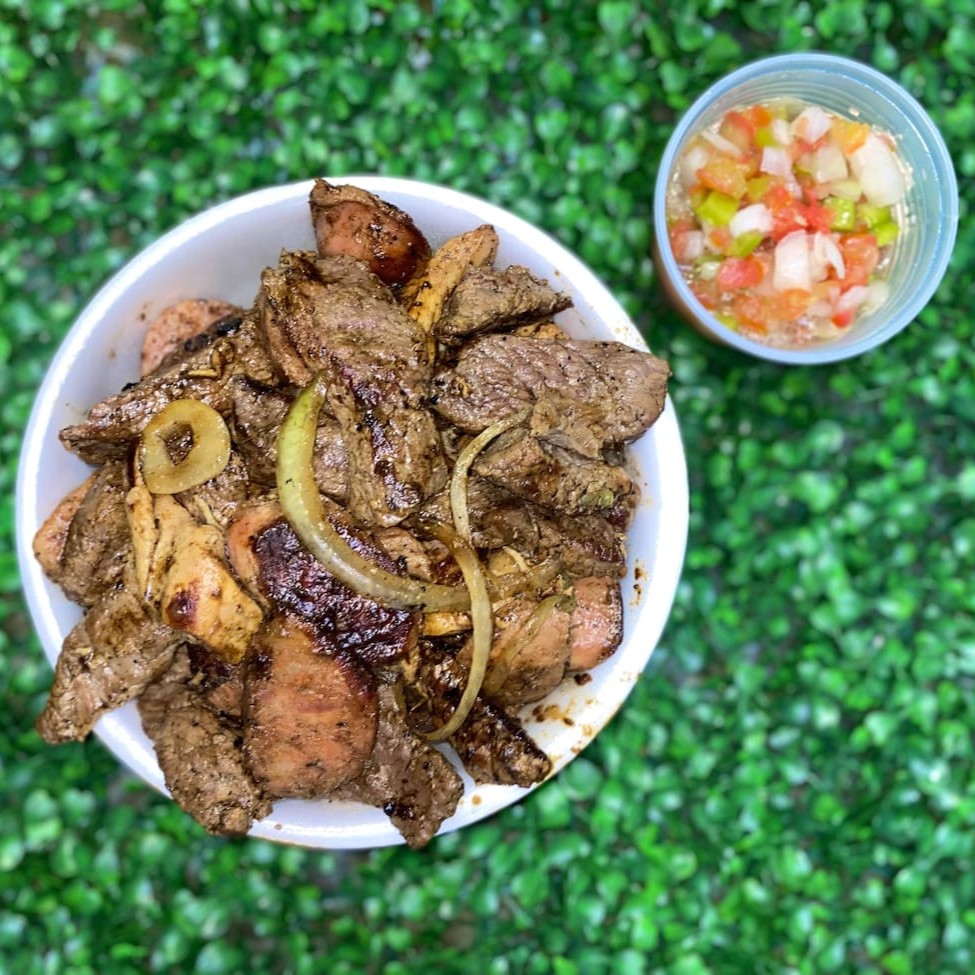 Porção de churrasco misto c/ vinagrete e farofa