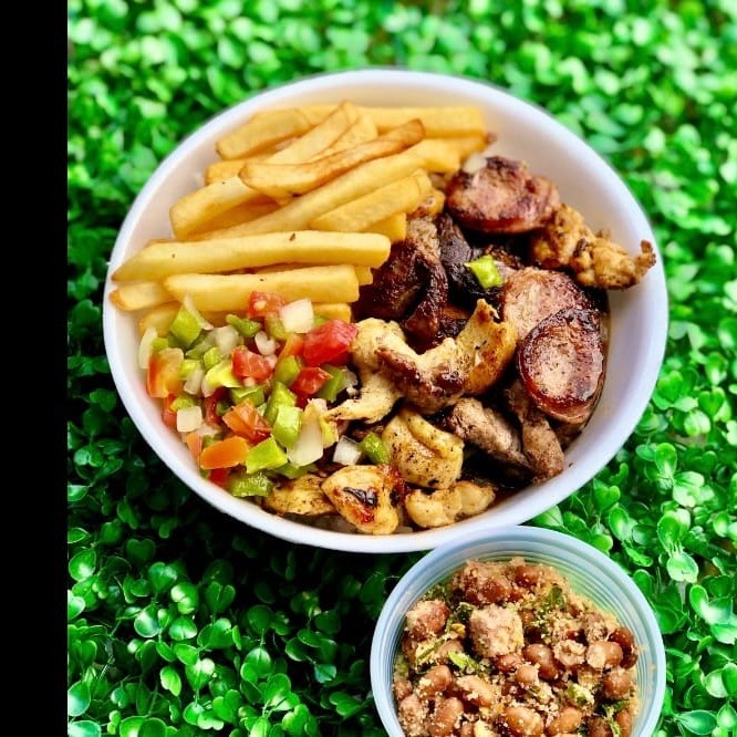 Porção de churrasco misto c/ , vinagrete, farofa e batata frita