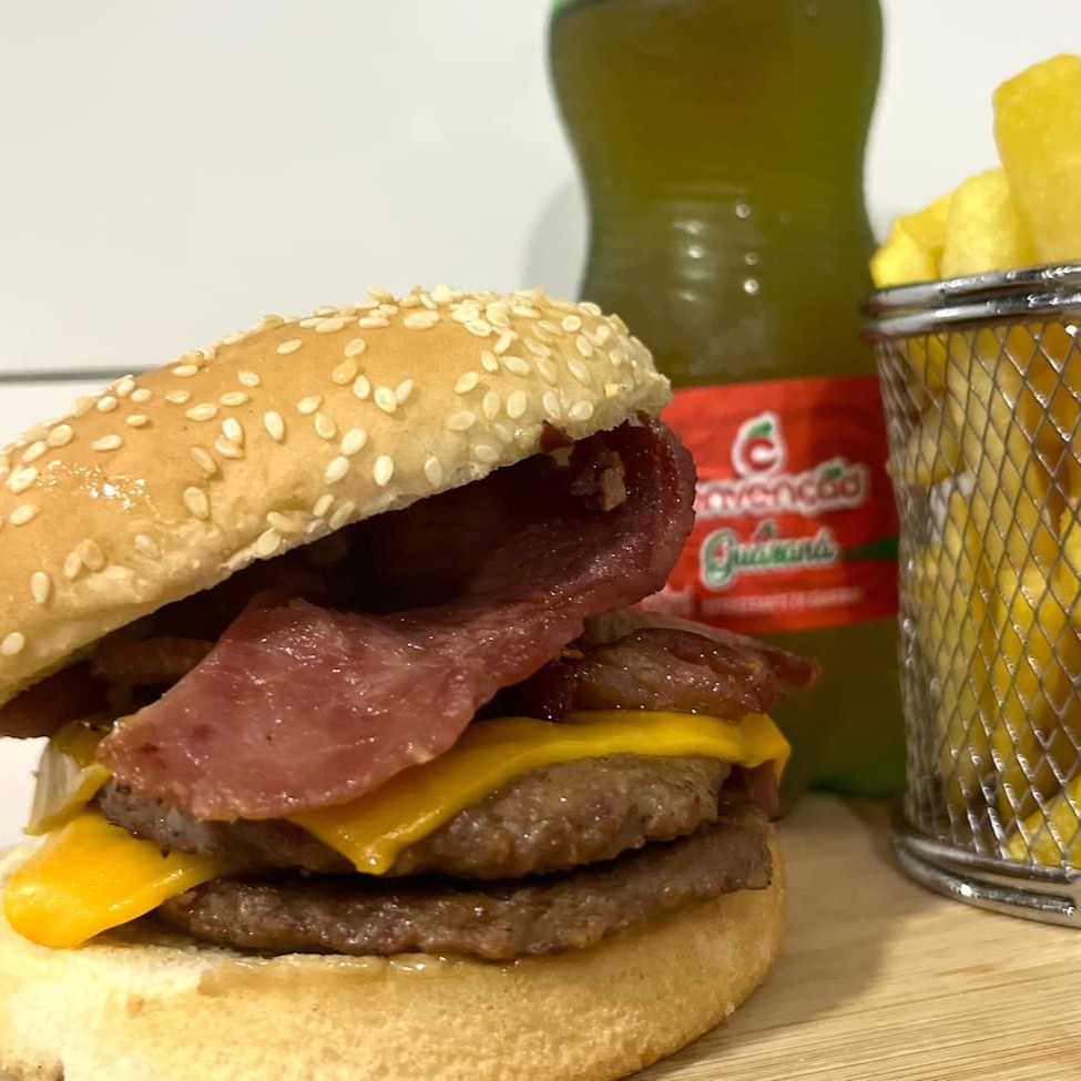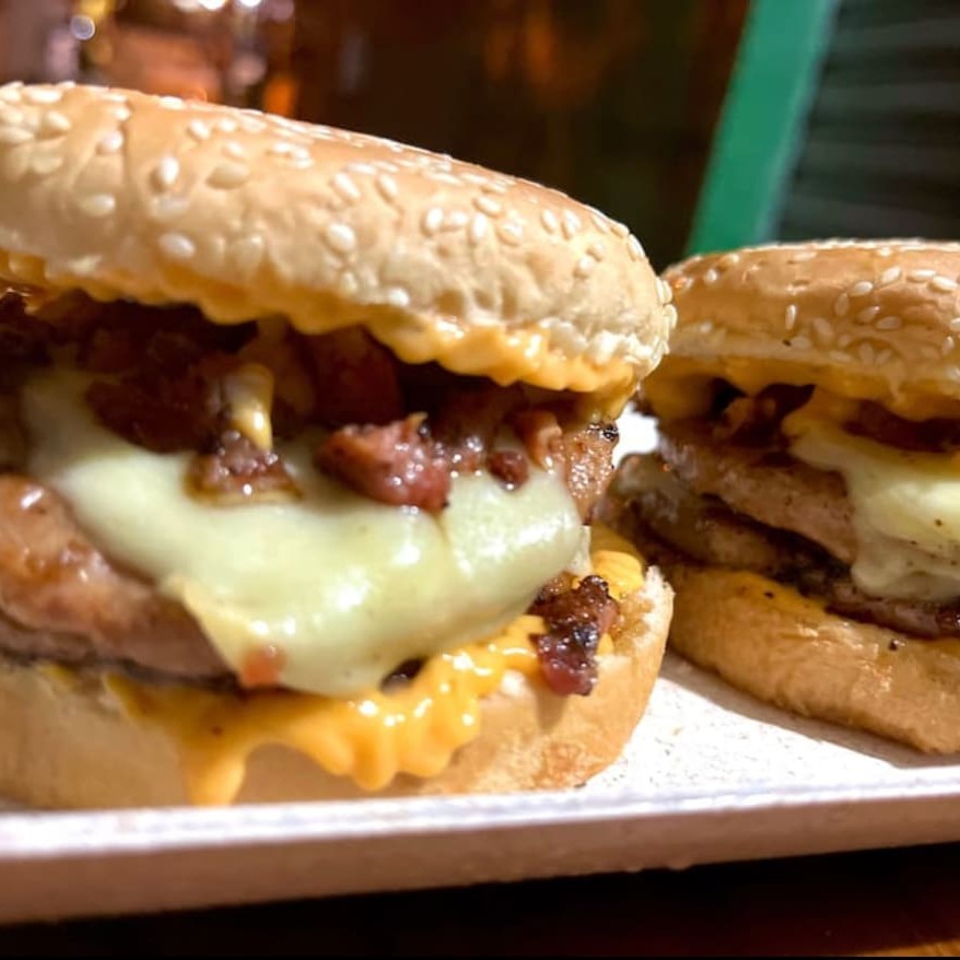 Pão, molho verde, 1 carne, queijo mussarela, 2 anéis de cebola e bacon