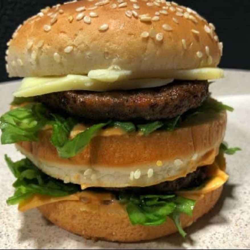 Pão 3 camadas, molho Billy Jack, 2 carnes, queijo cheddar e mussarela, cebola triturada e alface
