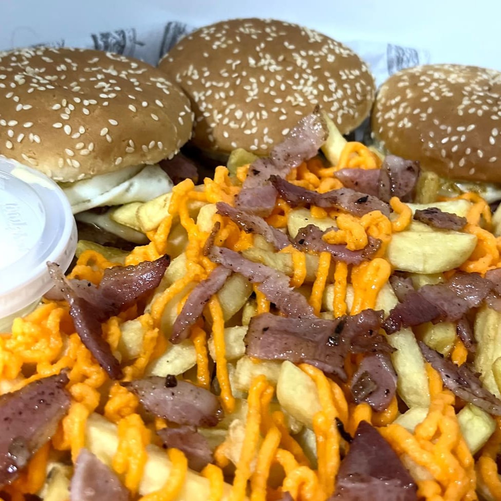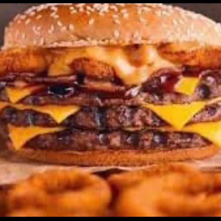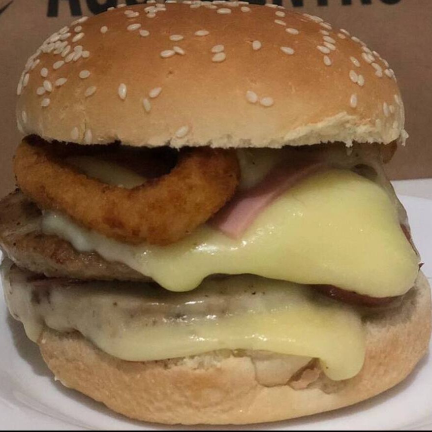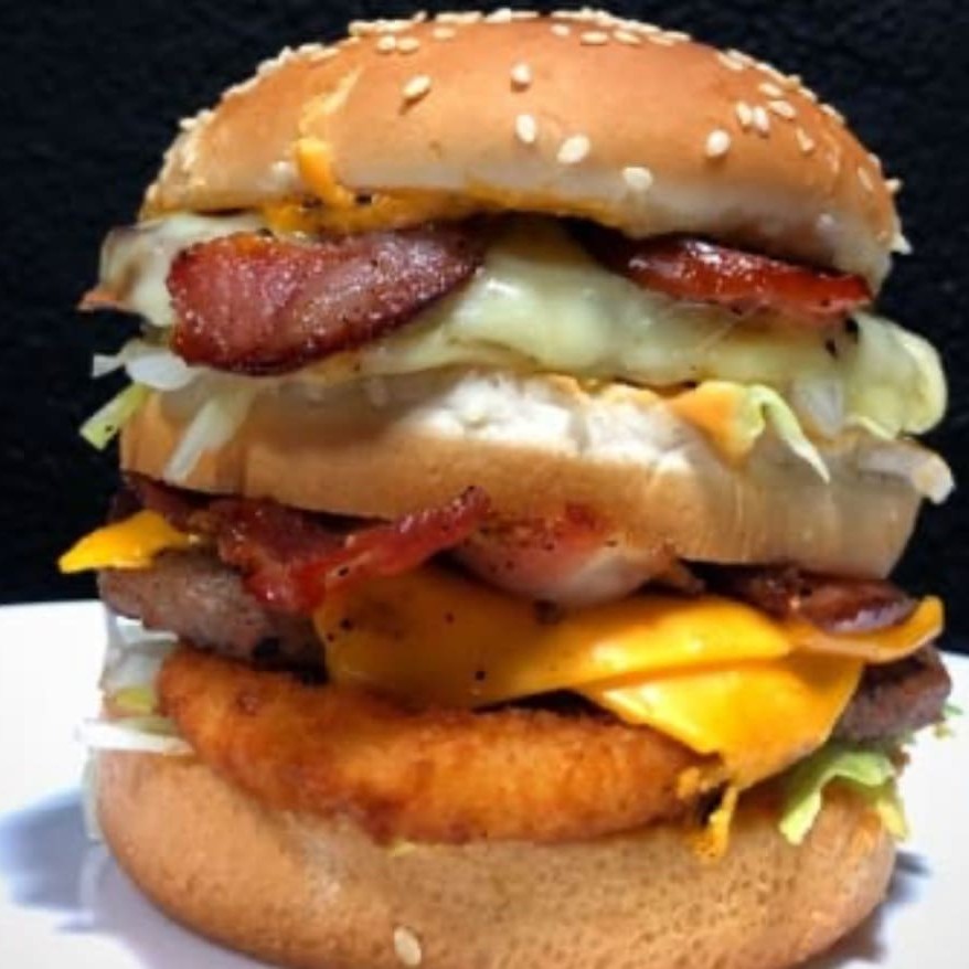 pão 3 camadas, 2 carnes, 2 aneis de cebola, cebola triturada, alface, calabresa, bacon, queijo cheddar e mussarela