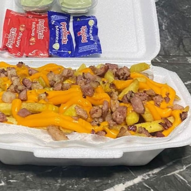 3 x tudo, batata com cheddar e bacon e 1 convenção 2 litros