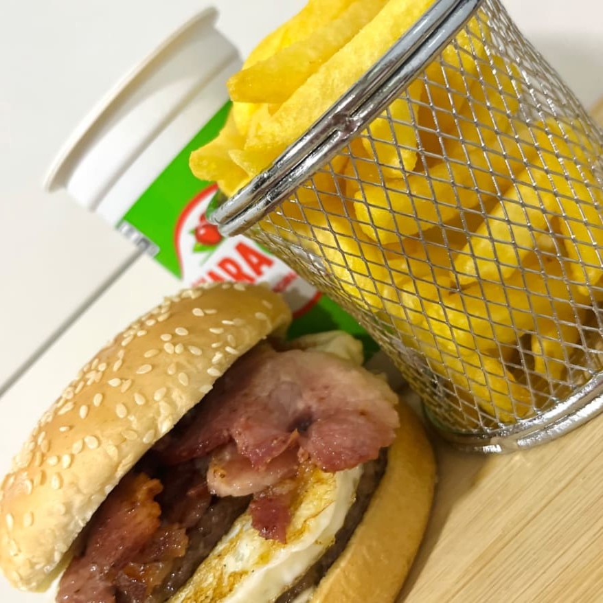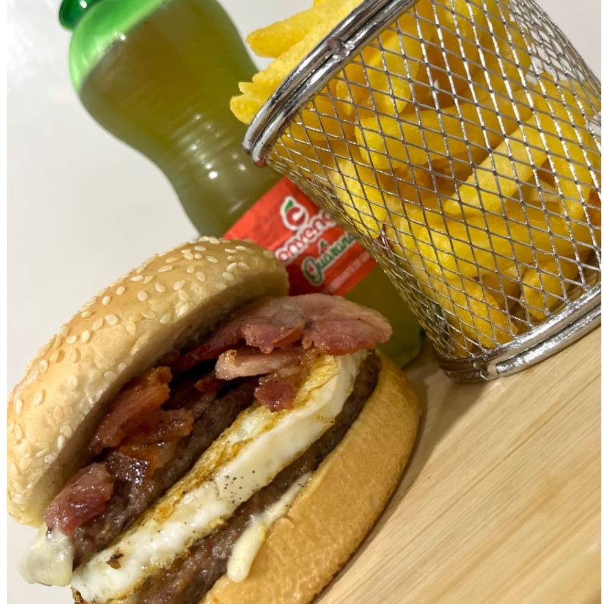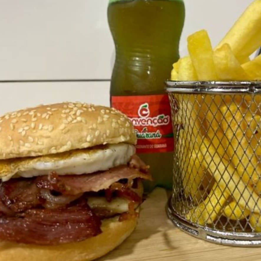Pão, molho verde, 2 carnes, queijo mussarela, bacon, calabresa, 1 ovo