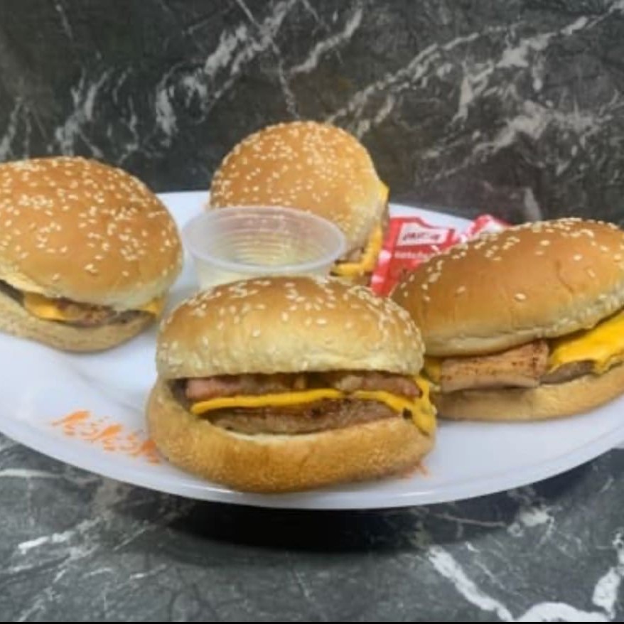 pão 3 camadas, billy jack, 2 carnes, alface e cebola triturada, queijo cheddar e mussarela