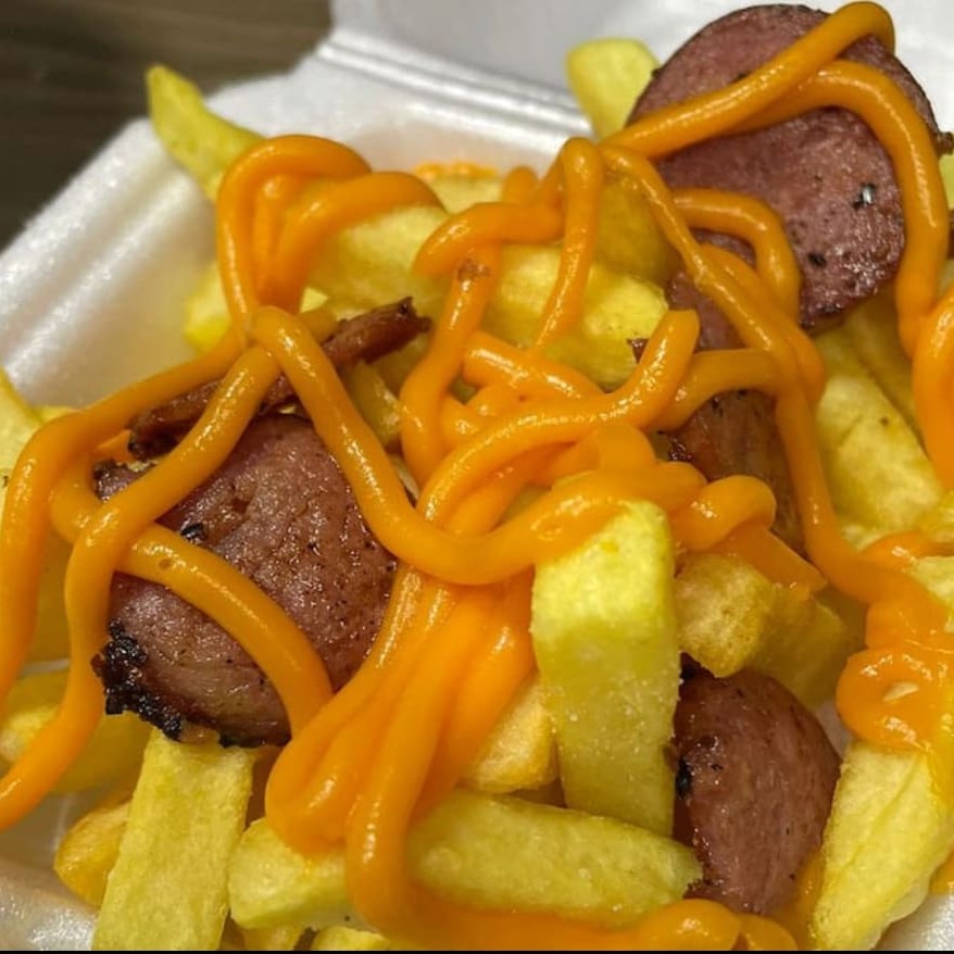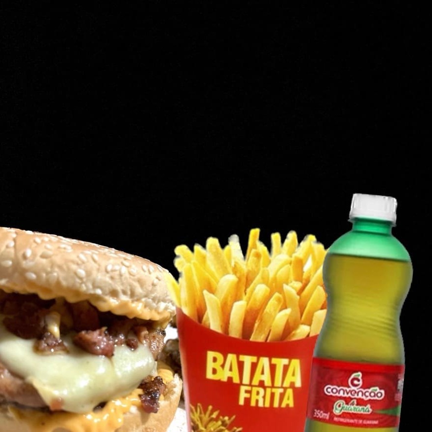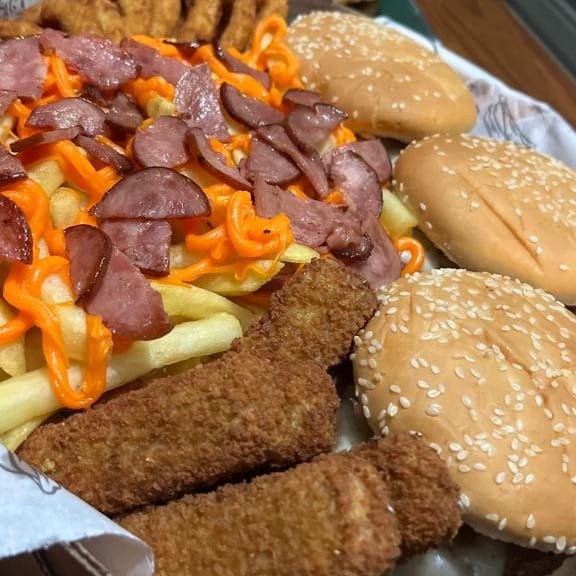 1 x tudo, 3 nuggtes, 4 anéis de cebola, 1 batata P, com cheddar e calabresa, 1 convenção 350 ml