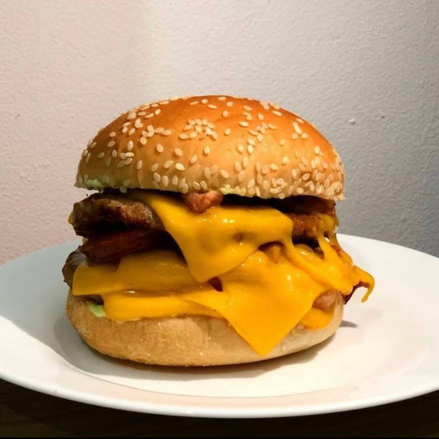 Pão, molho verde, 2 carnes, queijo cheddar e bacon