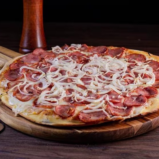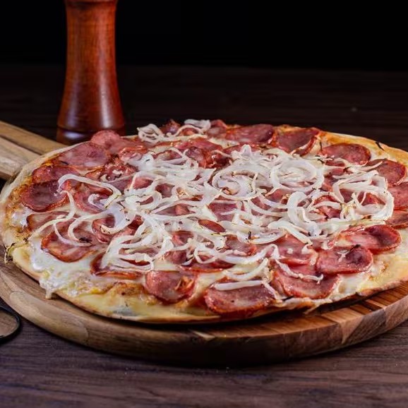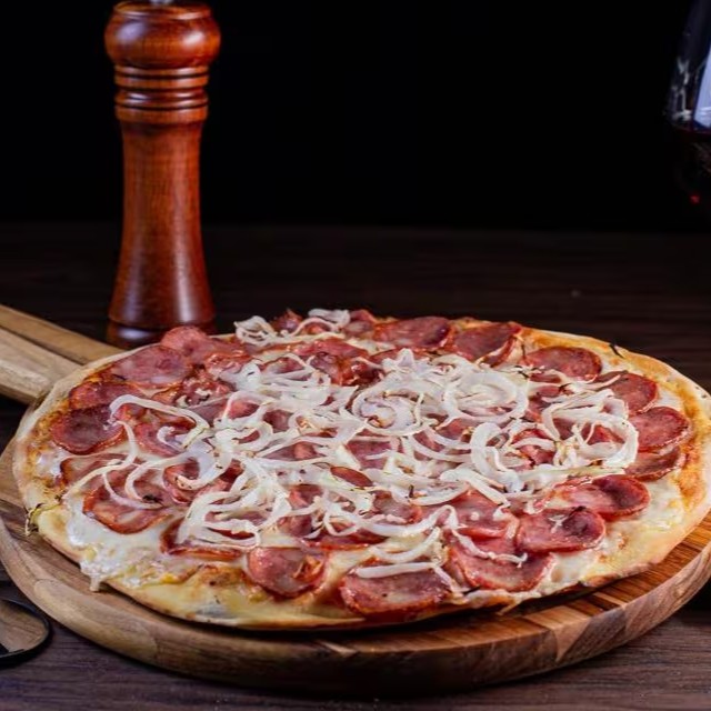 Número 1 de toda mesa! Calabresa douradinha, cebola fininha, muçarela derretendo e orégano por cima. É a redonda que não precisa de apresentação — só de um bom apetite.
