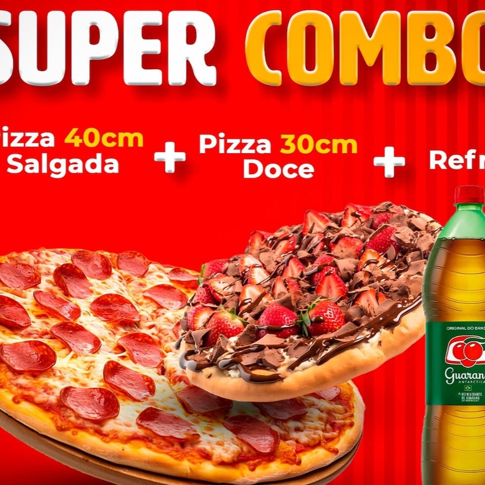 Combo de respeito: pizza salgada 40 cm recheada à escolha, pizza doce 30 cm e refrigerante gelado. Serve 3 4 pessoas e faz todo mundo cantar de boca cheia.