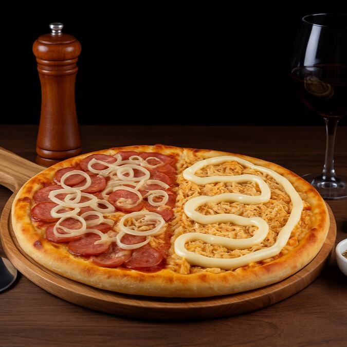 Aqui Vai uma pizza metade calabresa (com uma Calabresa douradinha, cebola fininha, muçarela derretendo e orégano por cima.) + metade Frango com Catupiry (Frango desfiado, Catupiry e muçarela com aquele molho que só o Sr. Pizza conhece). É Tradição Brasileira Pura!