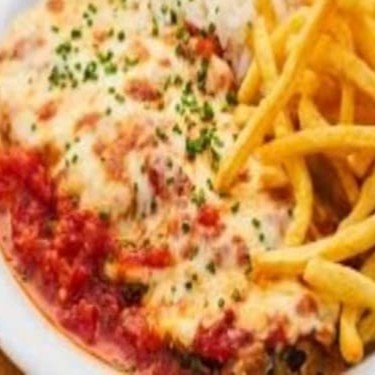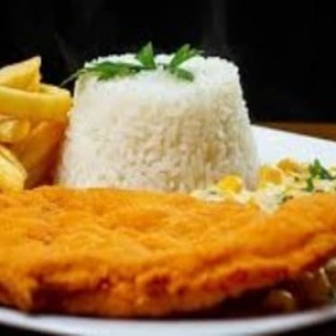Bife à Parmegiana acompanha Arroz, Feijão, Farofa e batata frita ou Salada