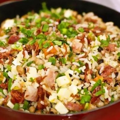 Baião de dois no capricho com aquele tempero nordestino, baccon fritinho e queijo coalho.