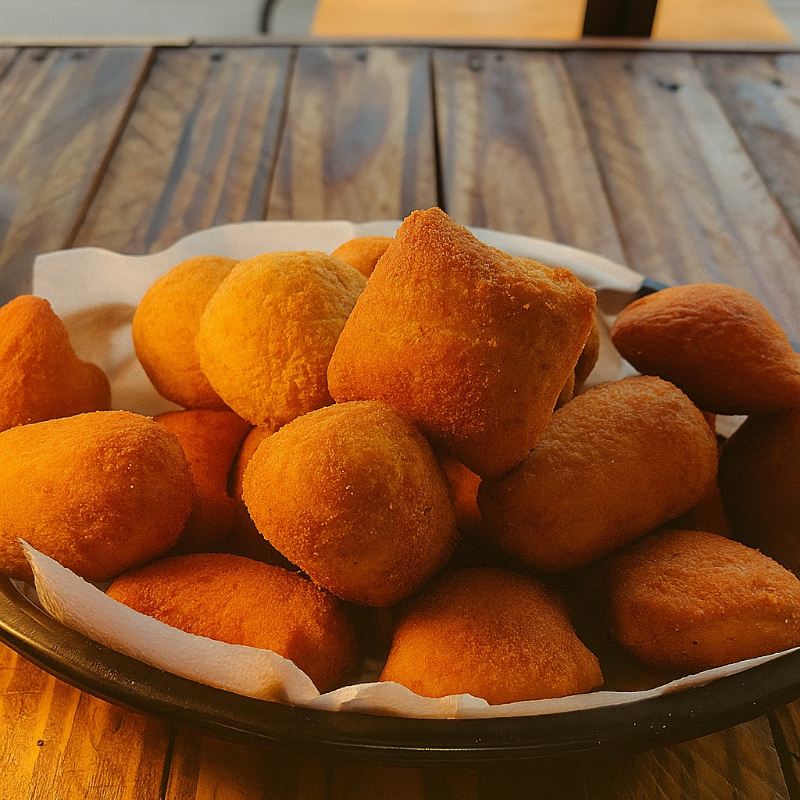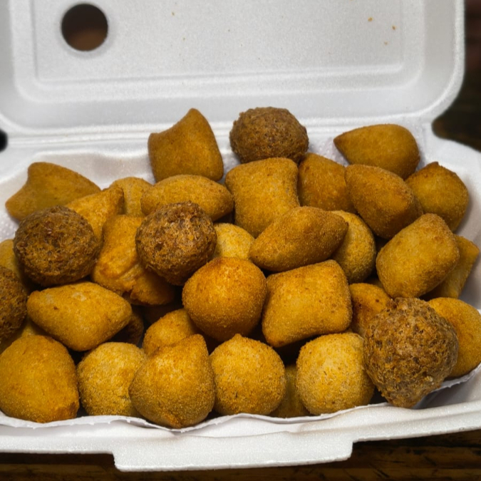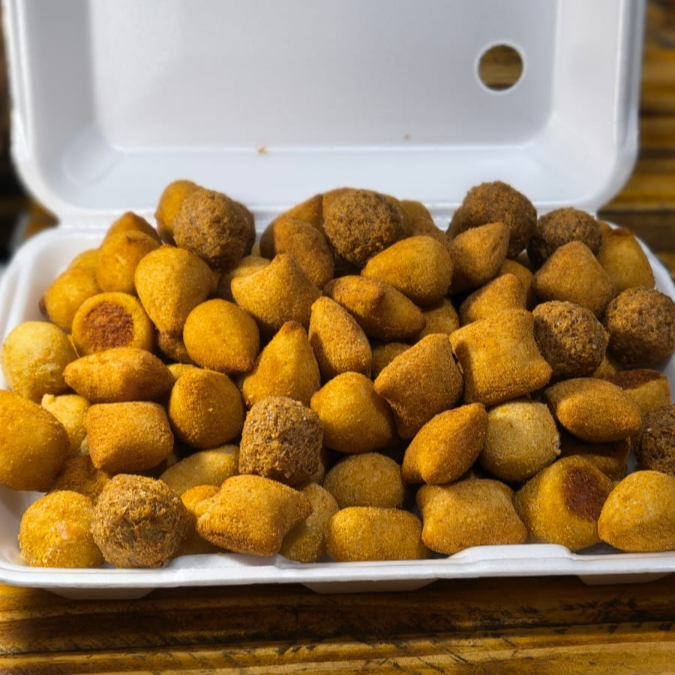 Sabores de hoje: Coxinha de frango, bolinha de queijo, calabresa, queijo com presunto, salsicha, frango com queijo e carne.
