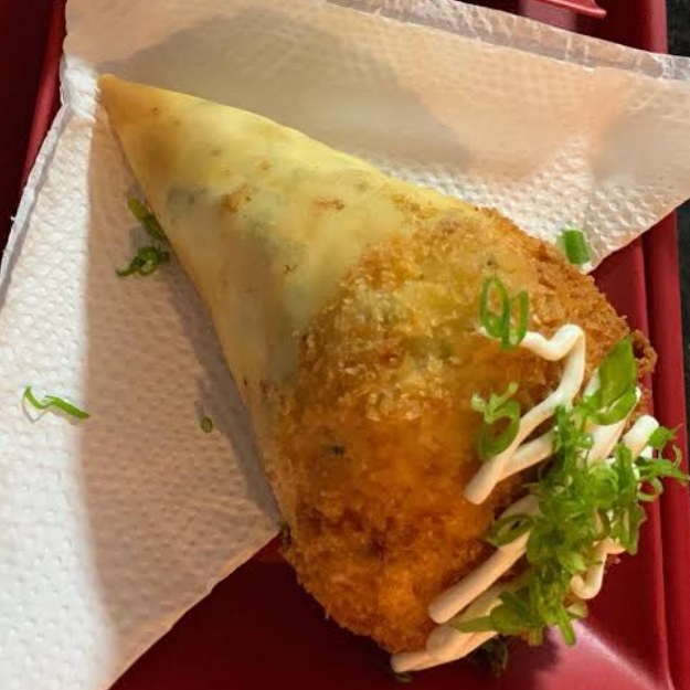 temaki frito, feito com nori recheado com camarão, creem cheese e cebolinha