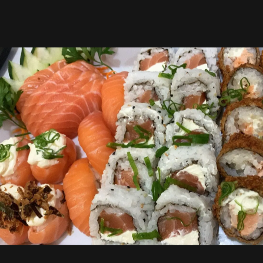5 sashimi de salmão, 5 sushi de salmão, 5 makimono de salmão, 10 hot filadélfia, 10 uramaki filadélfia