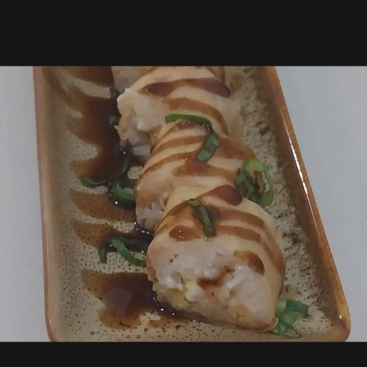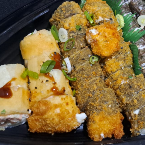 Feito com a massa do Harumaki,arroz, salmão, cream chesse, cebolinha, gergelim
