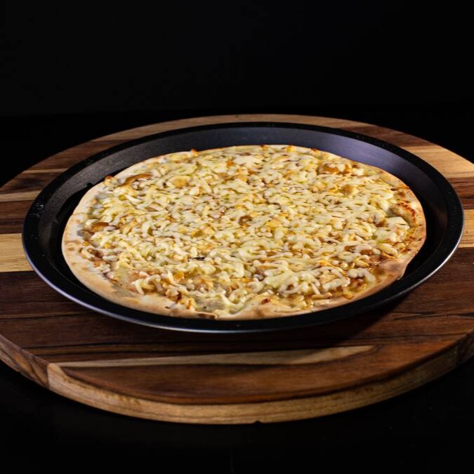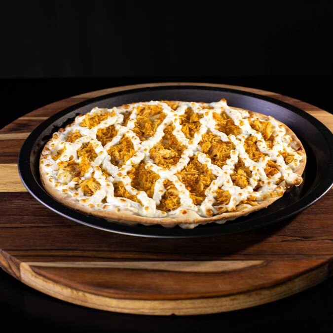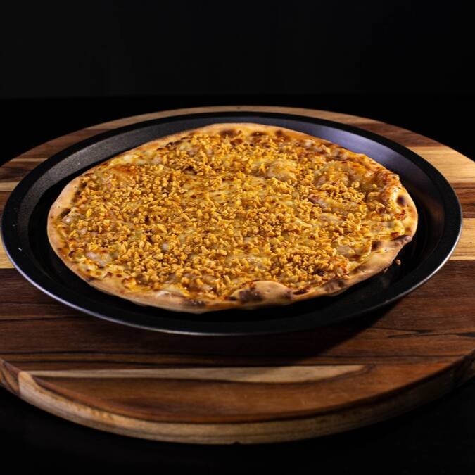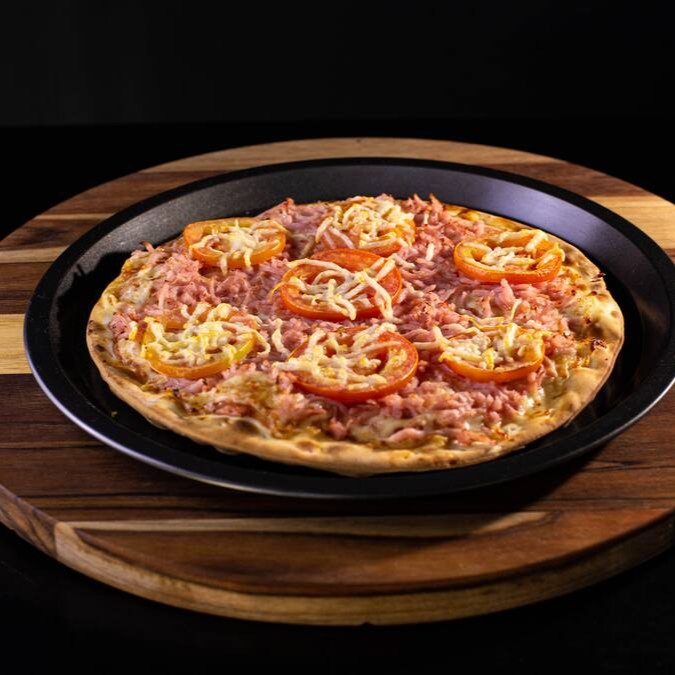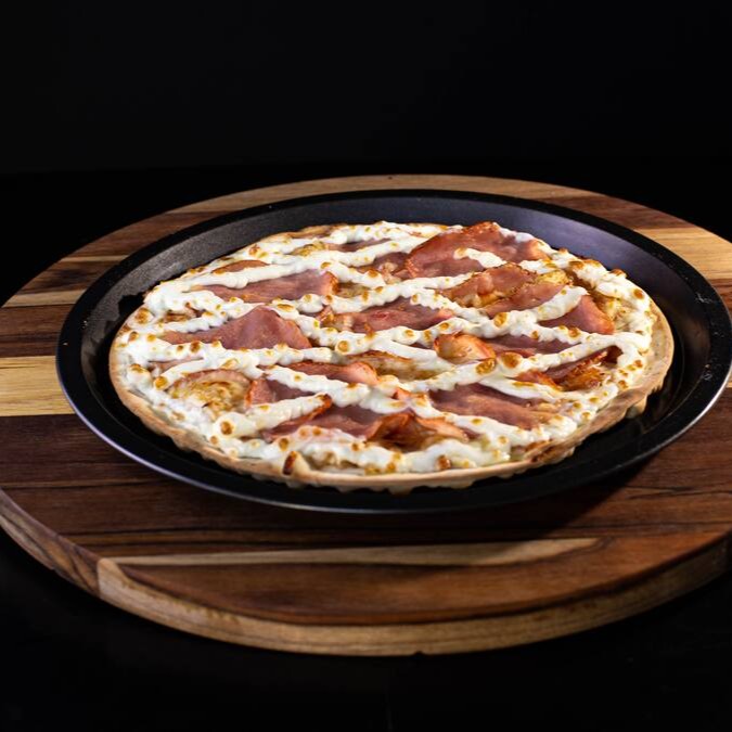 Molho, mussarela, peito de peru, bacon em cubos, Catupiry e orégano.