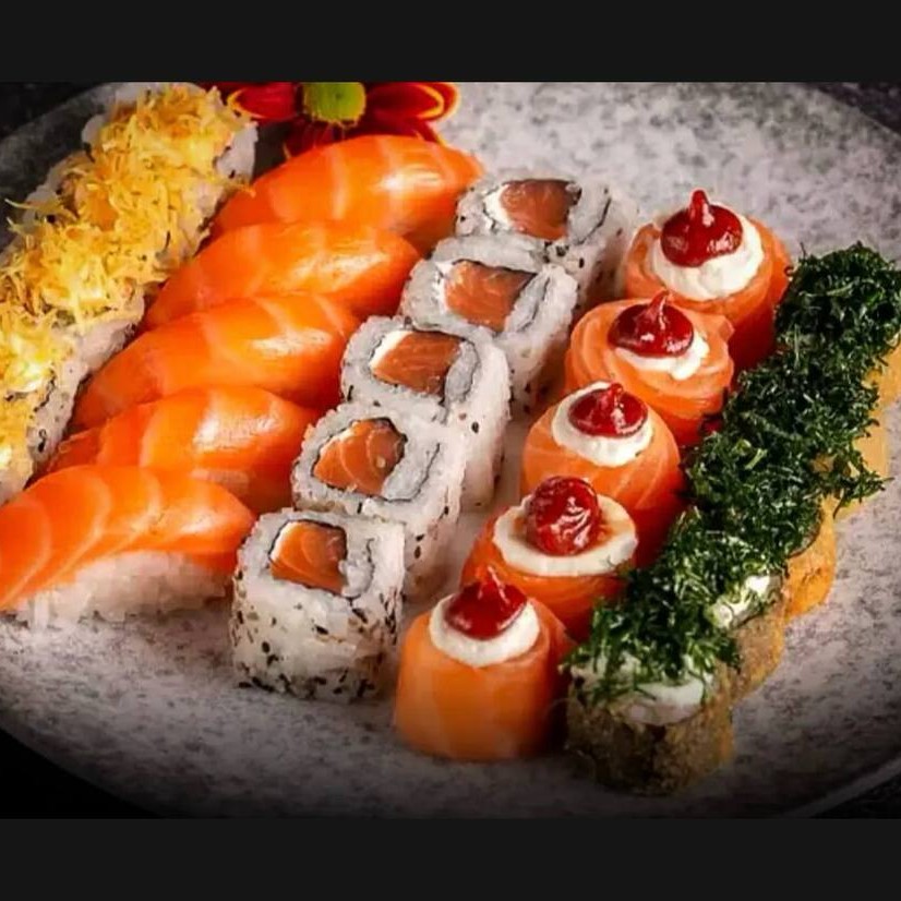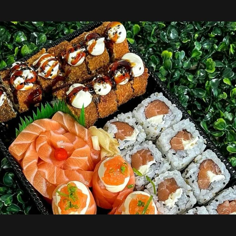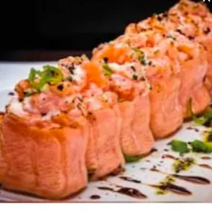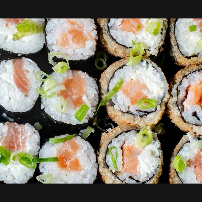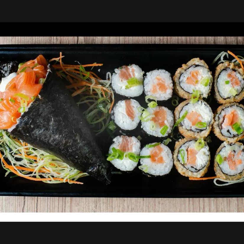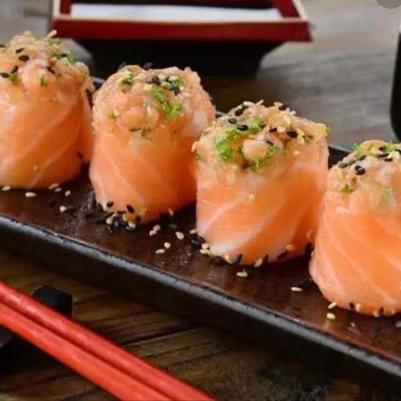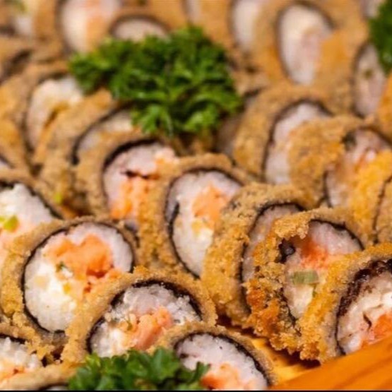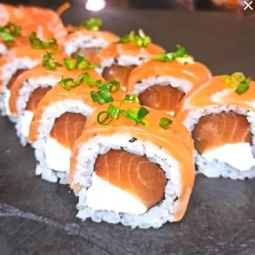 Arroz japones enrolado com alga, cream chesse da melhor qualidade e salmão fresco, peças podem ser cortadas em 10 unidades ou em 12 unidades.