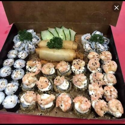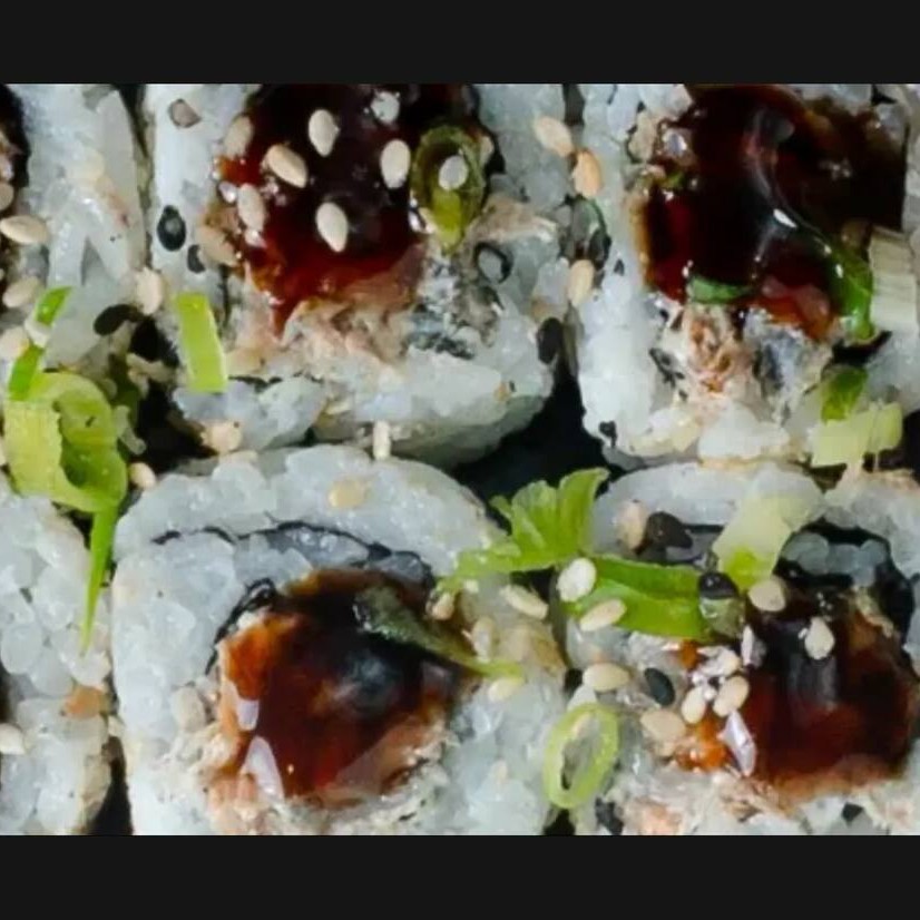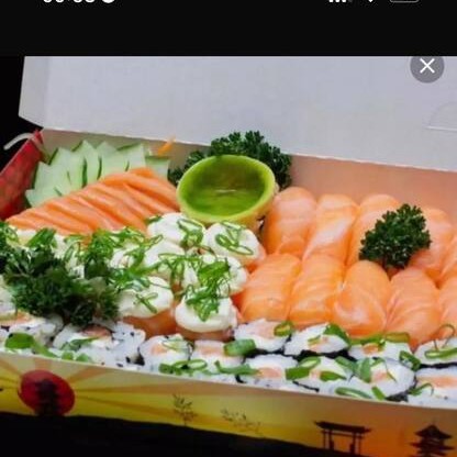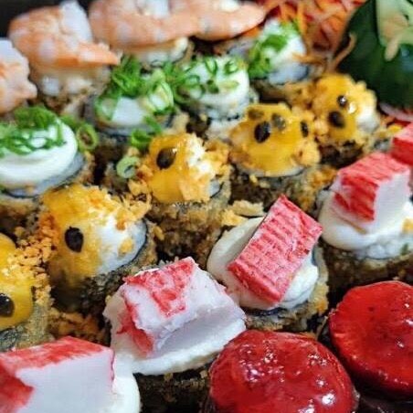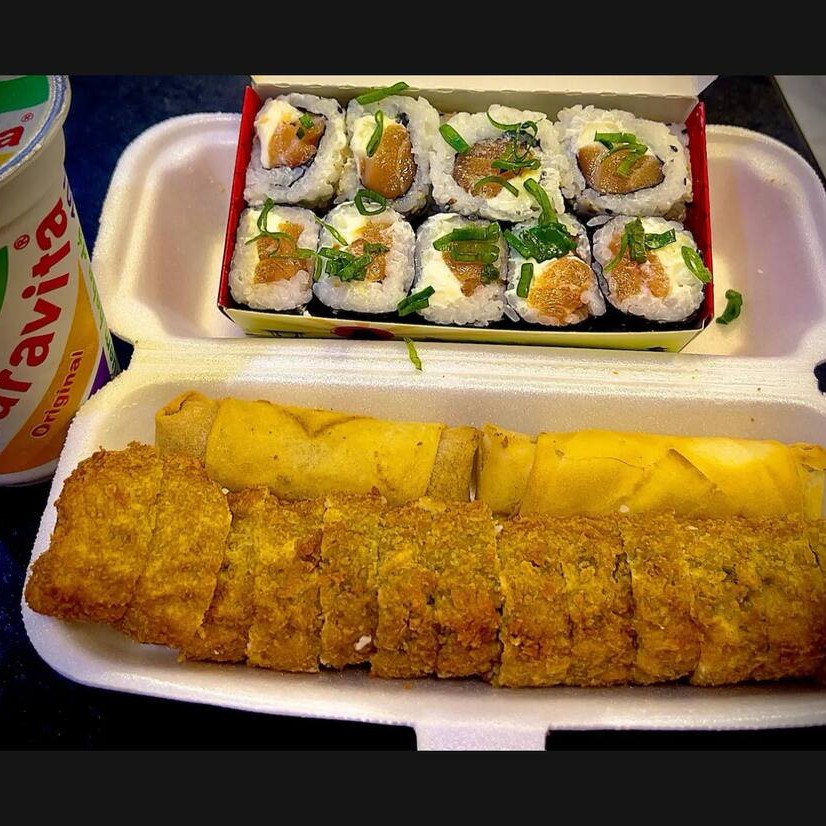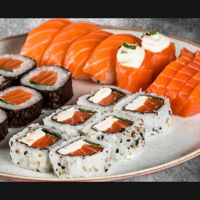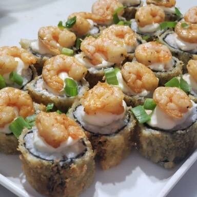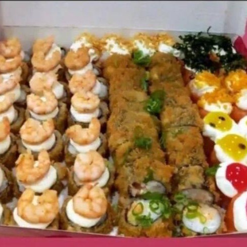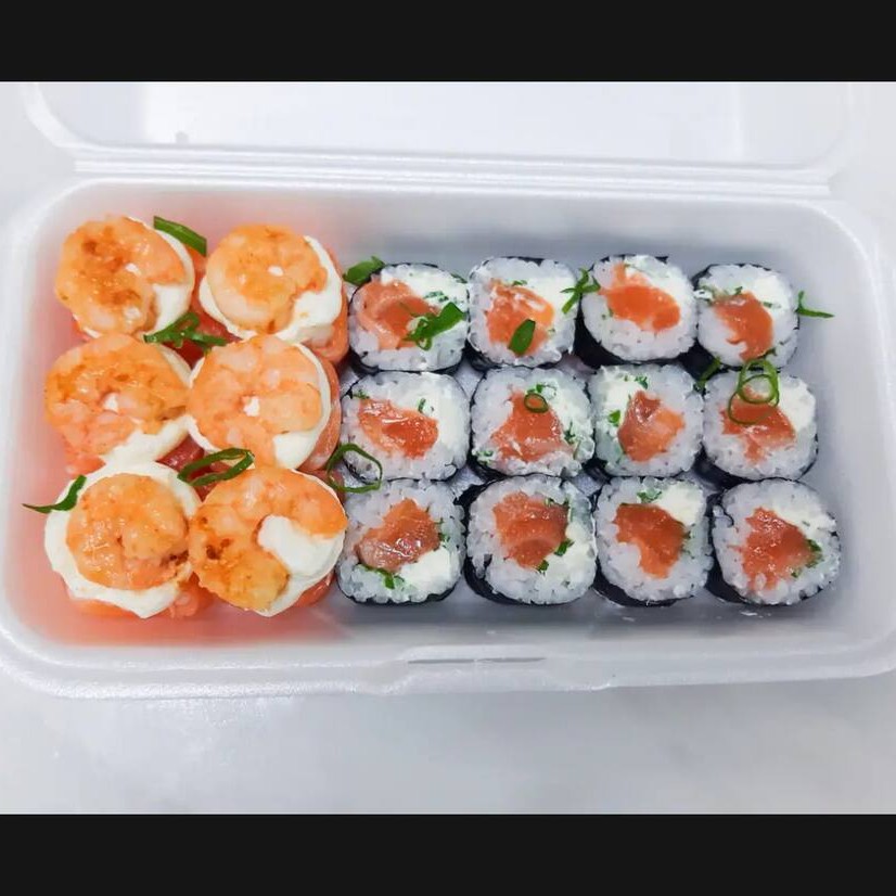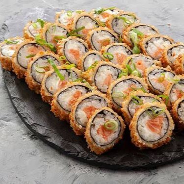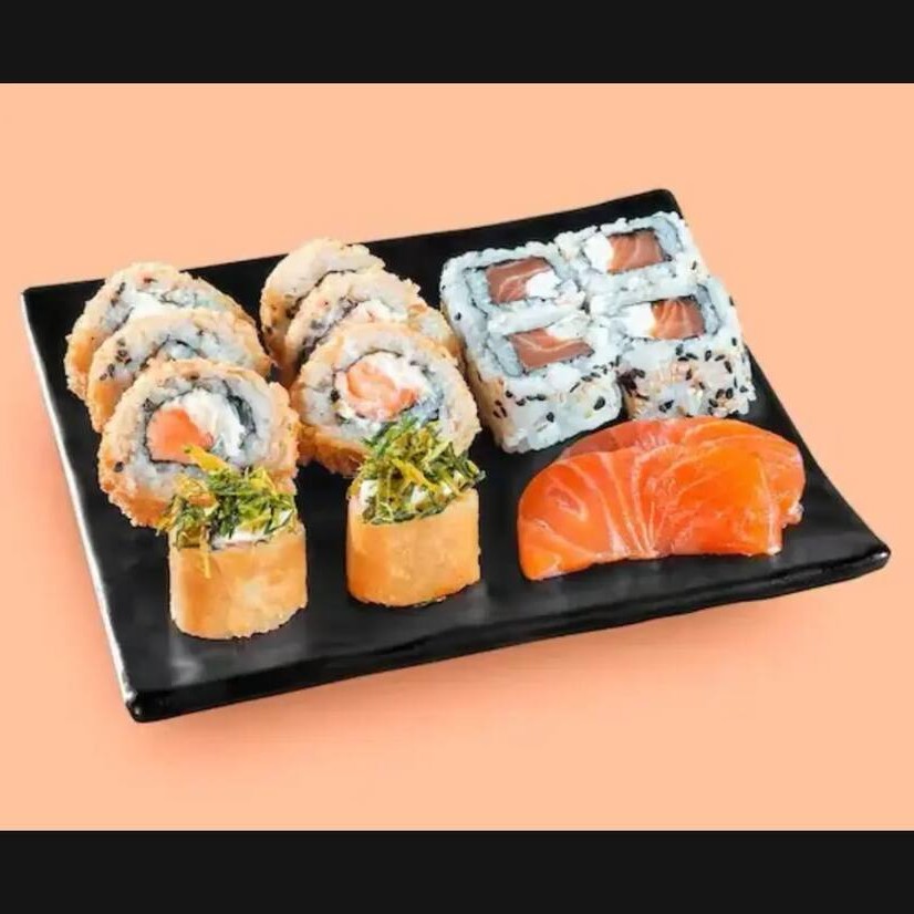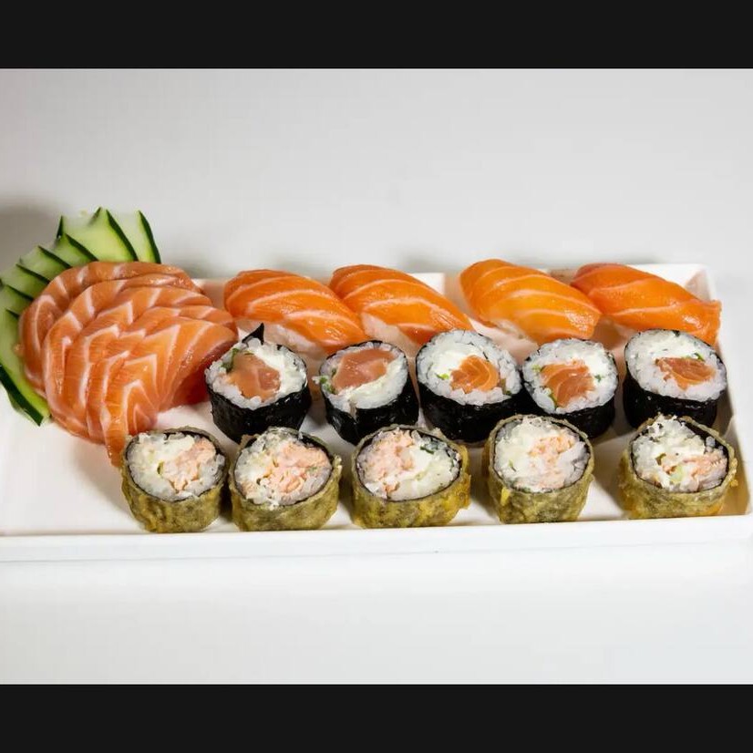 Arroz japones enrolado com alga, cream chesse da melhor qualidade e salmão fresco, peças podem ser cortadas em 10 unidades ou em 12 unidades.