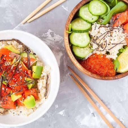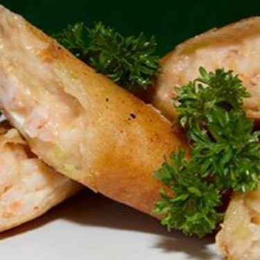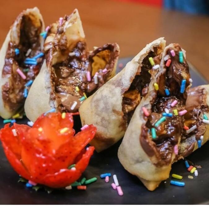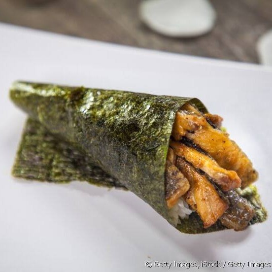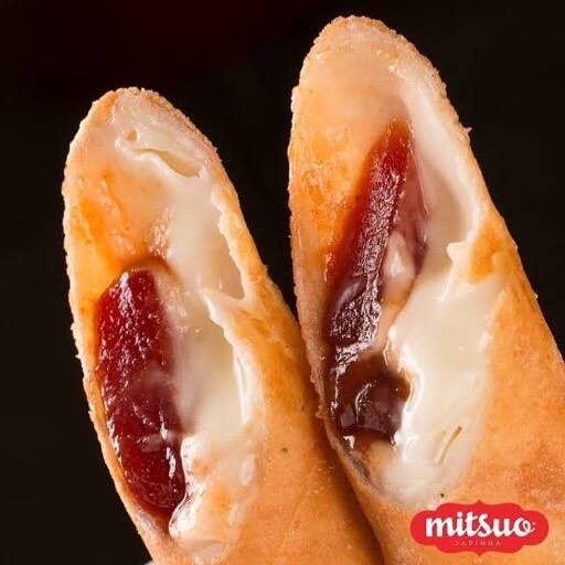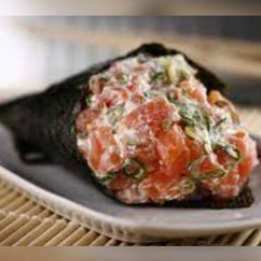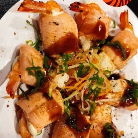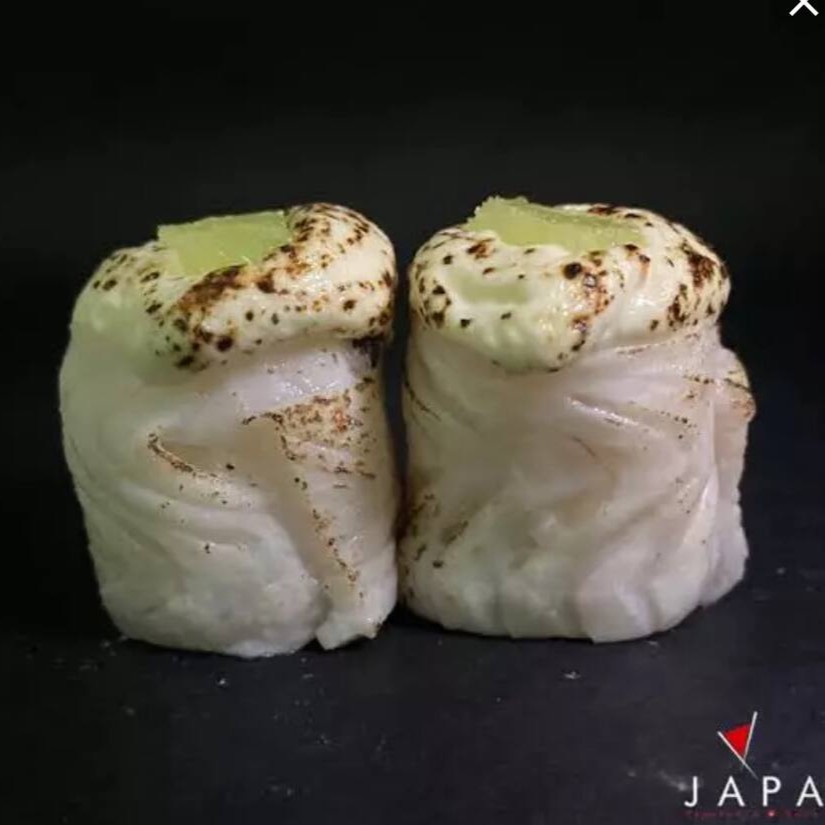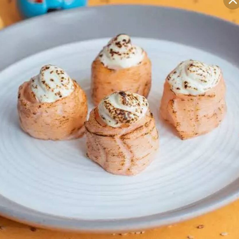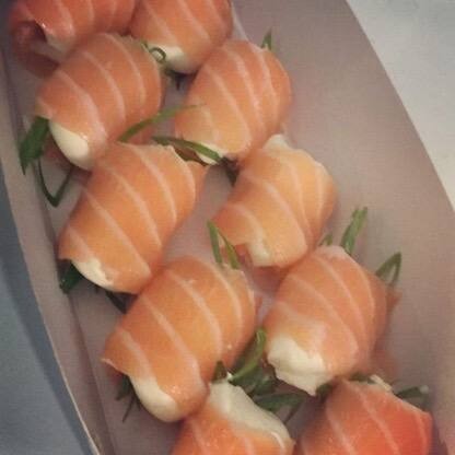 Casca de haromak enrolada com arroz salmão e creme creese.