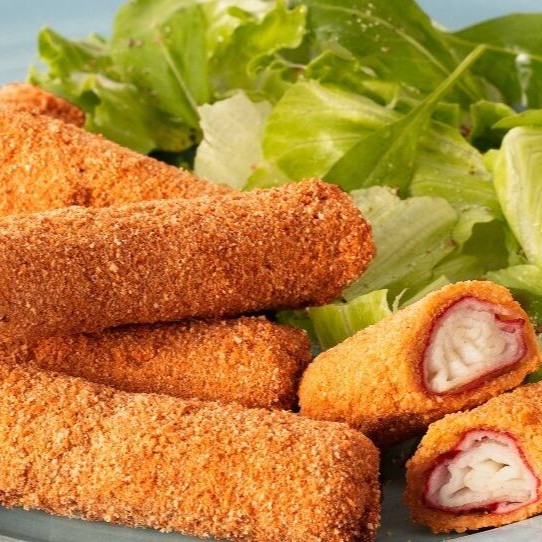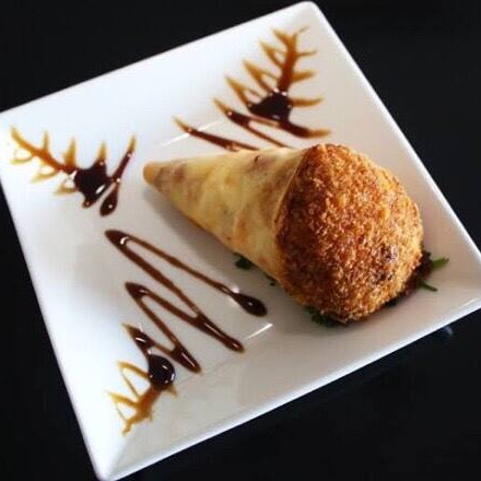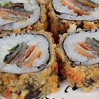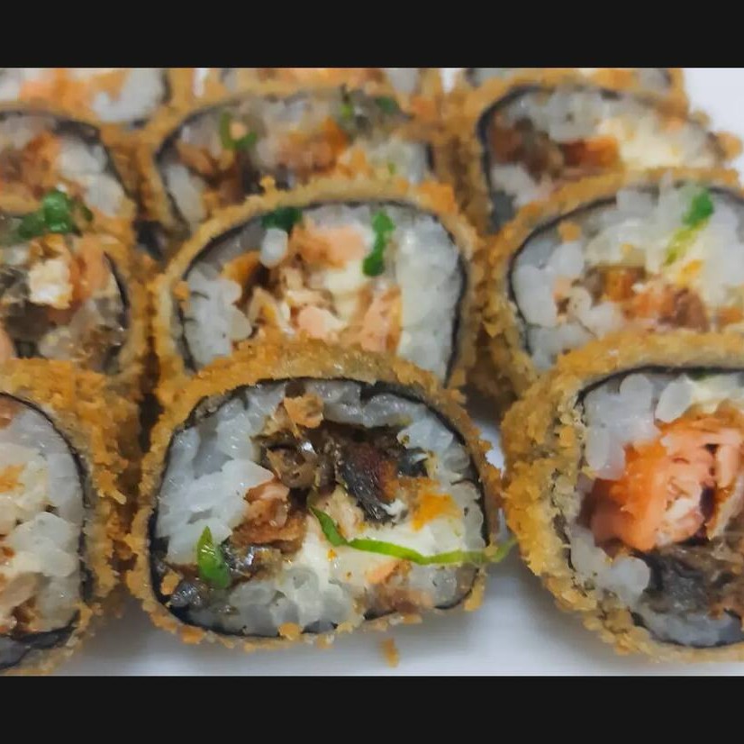 Arroz, salmão e creme cheese, empanado na farinha panki e frito.