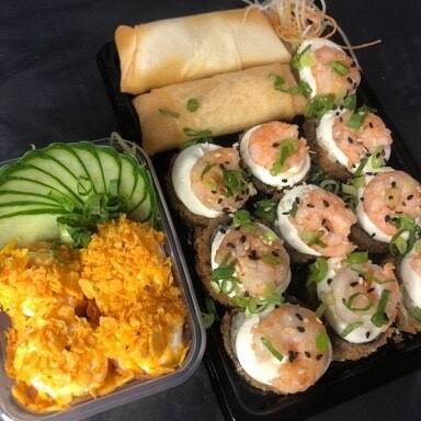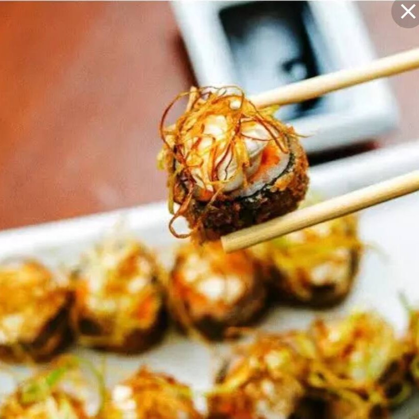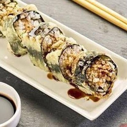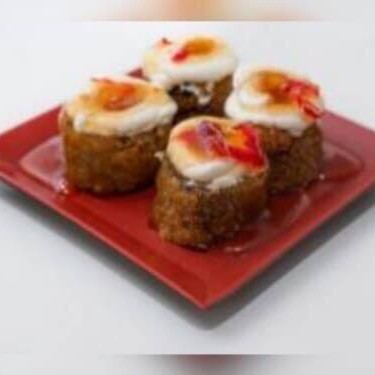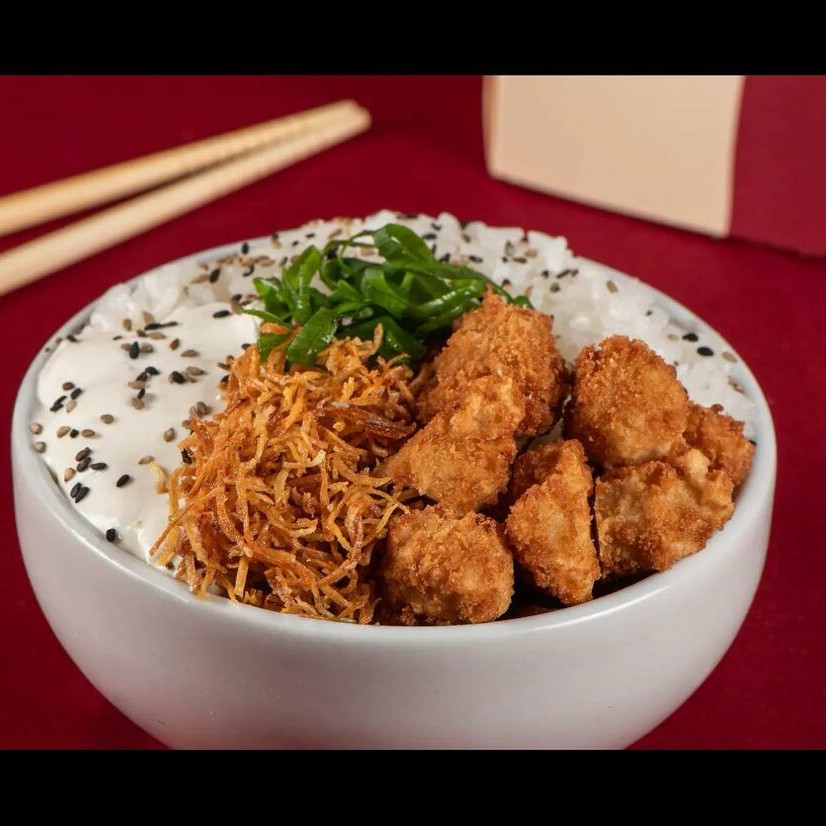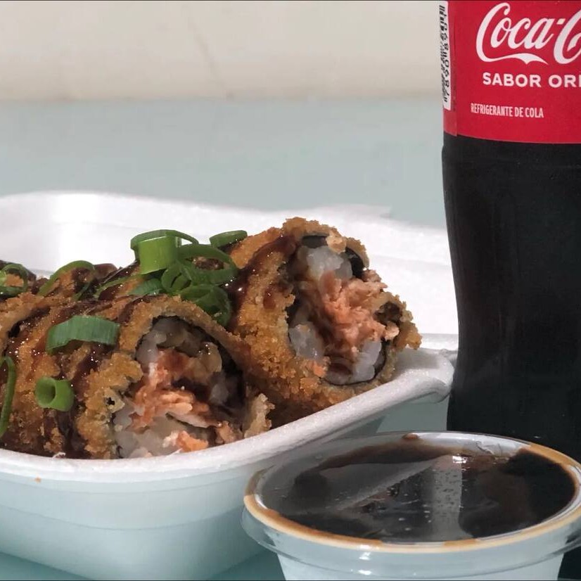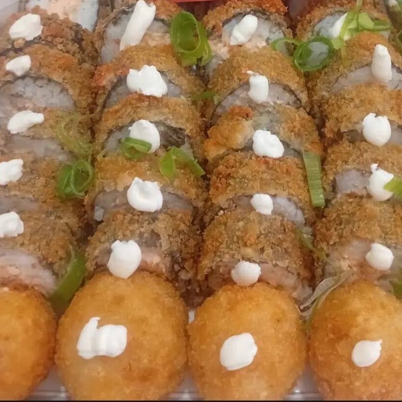 Arroz, atum, creme cheese, empanado na farinha panko.